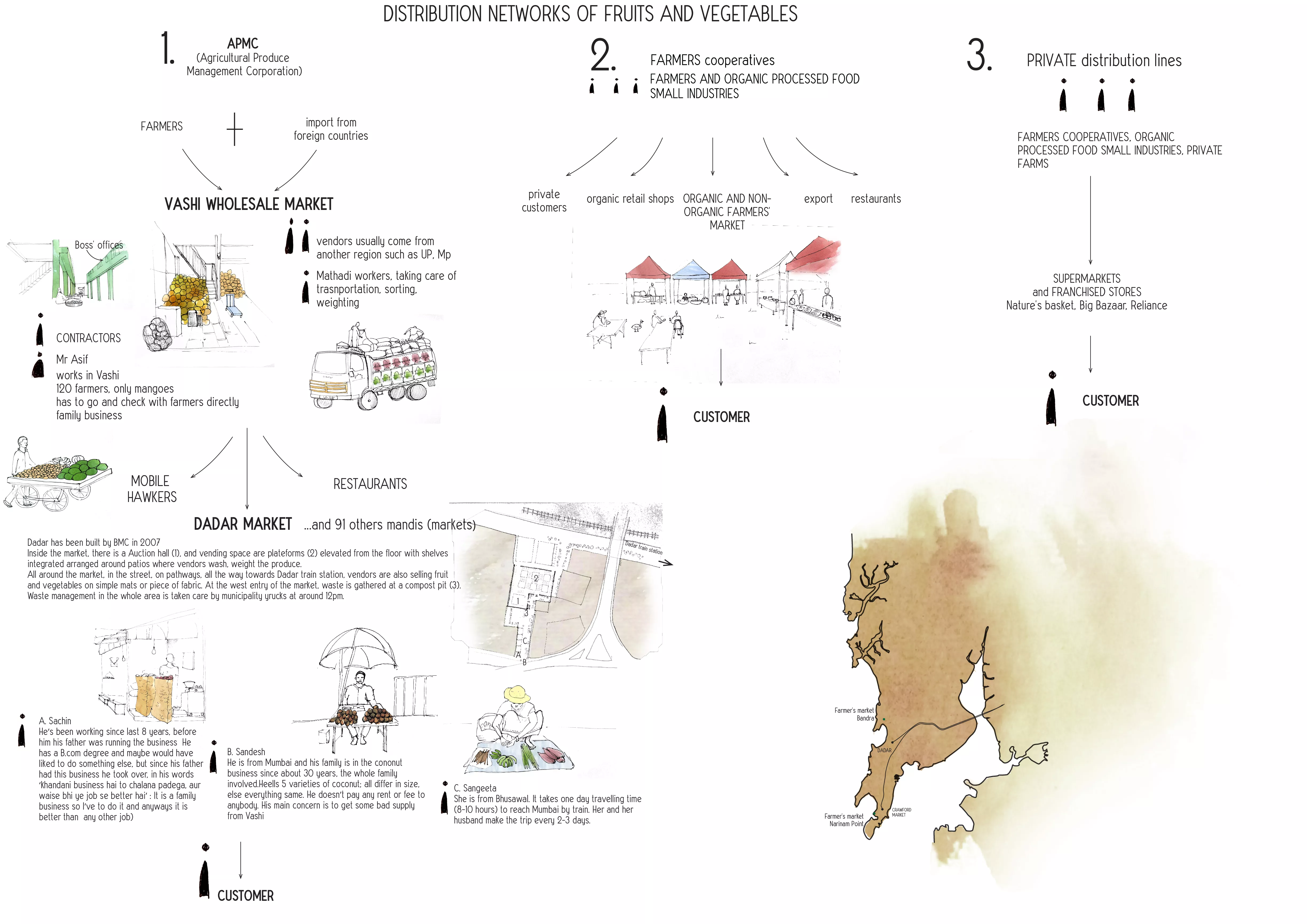 Not only the big glass-façade climatized expensive architecture are changing the landscapes of Mumbai’s street, but it is also generating new dynamics of people interaction who tend to reach peripheries using their car where before they used to get on the street and walk to the nearest vendor. The large-scale success of all these alternatives is awaited, yet they are worthy of interest from government and/or private investors. If the APMC now represents an institutionalised hierarchical system profiting only a few, these other channels are likely to emerge and give opportunities to individual farmers to get their work’s due.