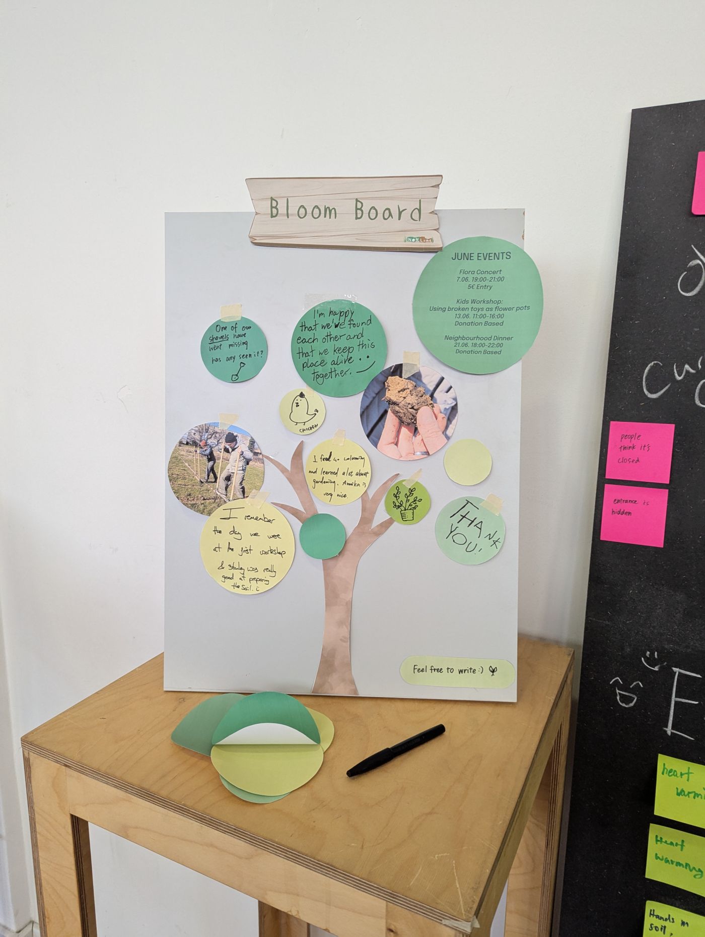 _A bulletin board (the bloom board) placed by the entrance, facing the street. It can display activities, events, workshops, and community feedback for passers-by to read. It serves as an open invitation to engage.
