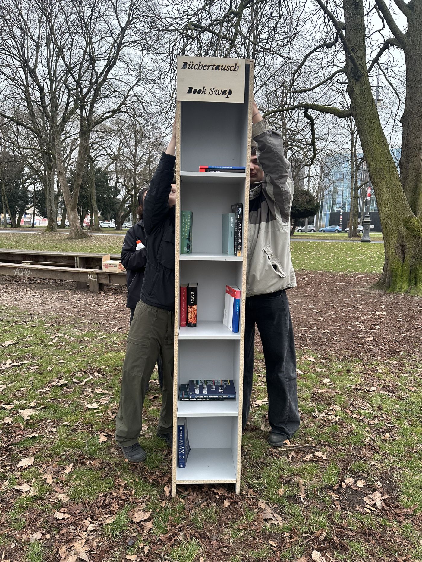 _A real-life Langer bookshelf, designed to prototype Langer Park into a reality and spark the curiosity of passers-by. The students built and installed an extra-tall bookshelf next to Langer Tisch. In Cologne, book swapping is a well-established practice, and by the following day, some books had already moved around!