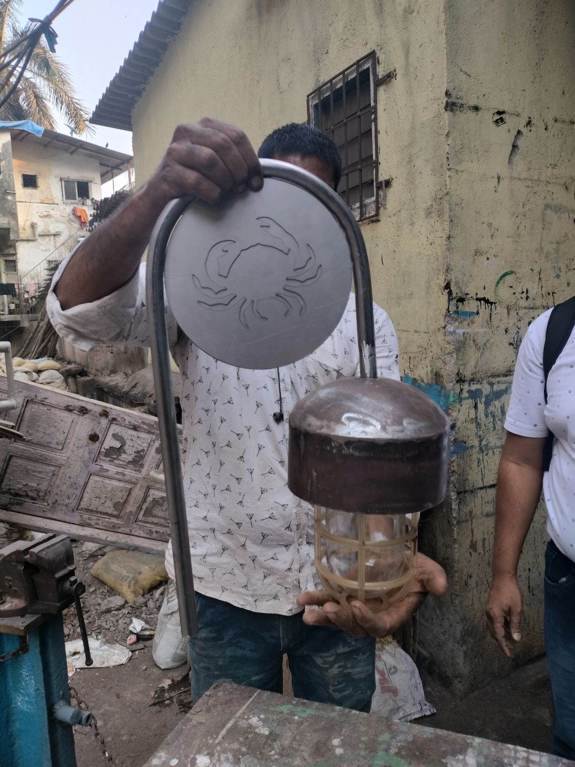 During one of our neighbourhood-level public engagements (Koliwada Charcha Exhibition), several residents shared the desire to have a symbol for Dharavi Koliwada, a neighbourhood whose indigenous history they believed was overshadowed by the story of Dharavi. Responding to the need for an urban indigenous identity, we incorporated elements into the design of the brackets for the lights. Dutta Koli, a fabricator in Koliwada, helped design and fabricate brackets that allowed us to convert some ship lights into customised wall-mounted lights. The lights incorporate the name of the village in Devanagari script with illustrations of crabs, clams and other fish that Dharavi Koliwada was known for.