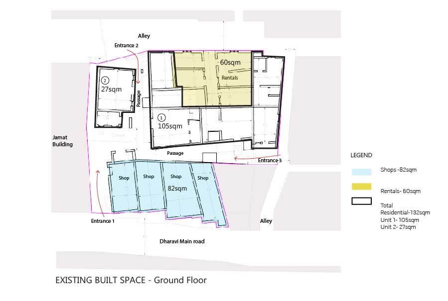 The Keny house is situated on Dharavi main road abutting the Koli Jamaat (community) building. Built incrementally, its earliest unit resembles the traditional chawl typology of Bombay comprising of a verandah running along the rooms that open onto it. Here, the verandah doubles up as a corridor giving access to a large central room and consecutive smaller rooms. Over the years, the house has been incrementally constructed to accommodate the new additions to the family which now comprises 38 individuals. The house is now three storeys tall. Currently, the total built area is unevenly distributed amongst the five brothers. In addition to the Keny residence, the ground floor also has a few shops and small residential units, which the Keny’s give out on rent. The main entrance of the Keny house opens into a small outdoor space holding the tulsi plant (the holy basil), this leads to a maze of narrow passages and staircases that effectively bring in slivers of light and breeze.
