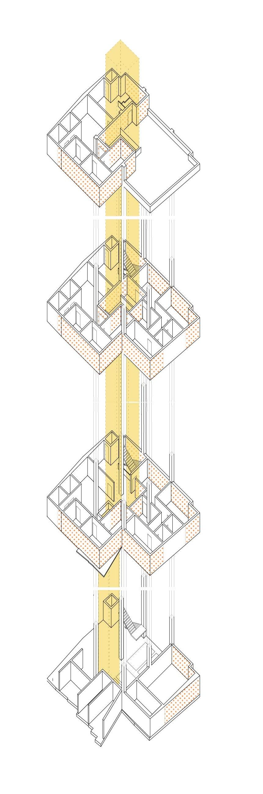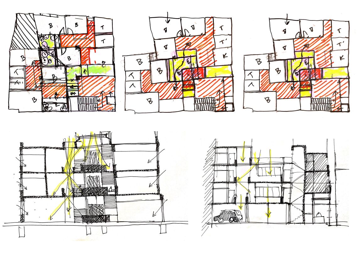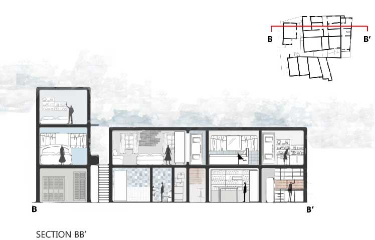 On the ground floor, the area for the shops is retained along with the small residential units and space for four car parks. The vertical circulation, both the staircase and elevator, open up to a common living area on each floor. The area on each floor is equally divided into a total of eight studio apartments (30 Sq.mts each), four for each brother. Four of the units are accessed from the shared living room, the other four are accessed by a verandah off the shared living room and overlooking the courtyard.