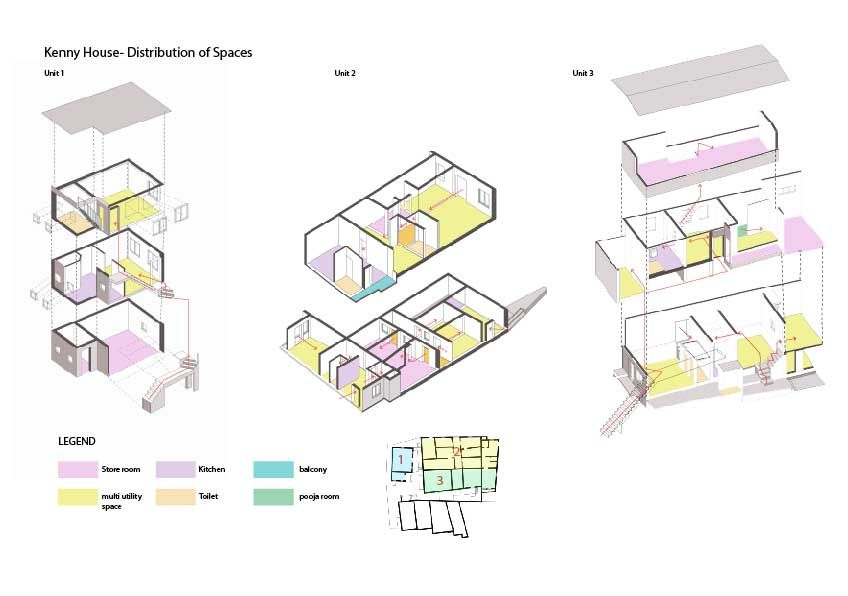 The brothers want to accommodate future generations of the Keny family, however they are certain about one thing - no shared kitchens and toilets. Shared household functions like cooking were common within joint families, this has changed over the years with women opting to have their own kitchens to better manage their time and resources. The sharing of toilets, although typical of the chawl system, is undesirable in families that aspire to a higher standard of living. Having your own toilet, however small, goes a long way to achieve these socio-cultural needs and aspirations. It became clear to us that the way forward would be to envision the new building as a space designed to accommodate some aspects of communal living yet maintain the autonomy of each nuclear family. Thus, to gauge and balance the needs and aspirations becomes critical.