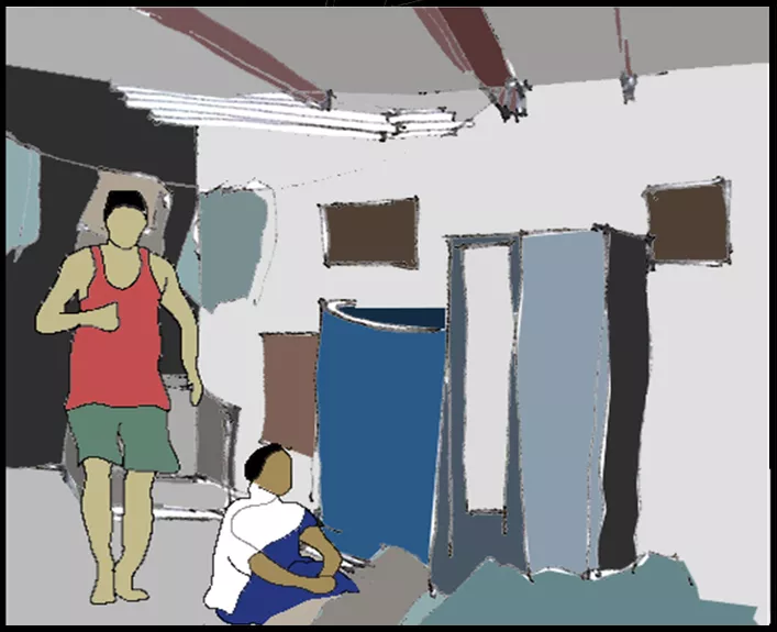 A small lane to the left from Dharavi depot road, towards Maharashtra Nature Park, opens up to a small open space with Muzaffar’s tool – house as a back drop. With children playing in the open area, and people using it for transition, it remains lively. An external ladder from the ground floor leads up to Muzaffar’s garment workshop which is a 225 sq. ft. area with 8 sewing machines and 7 workers, 3 to 4 of whom stay in the workshop at night for security purpose.