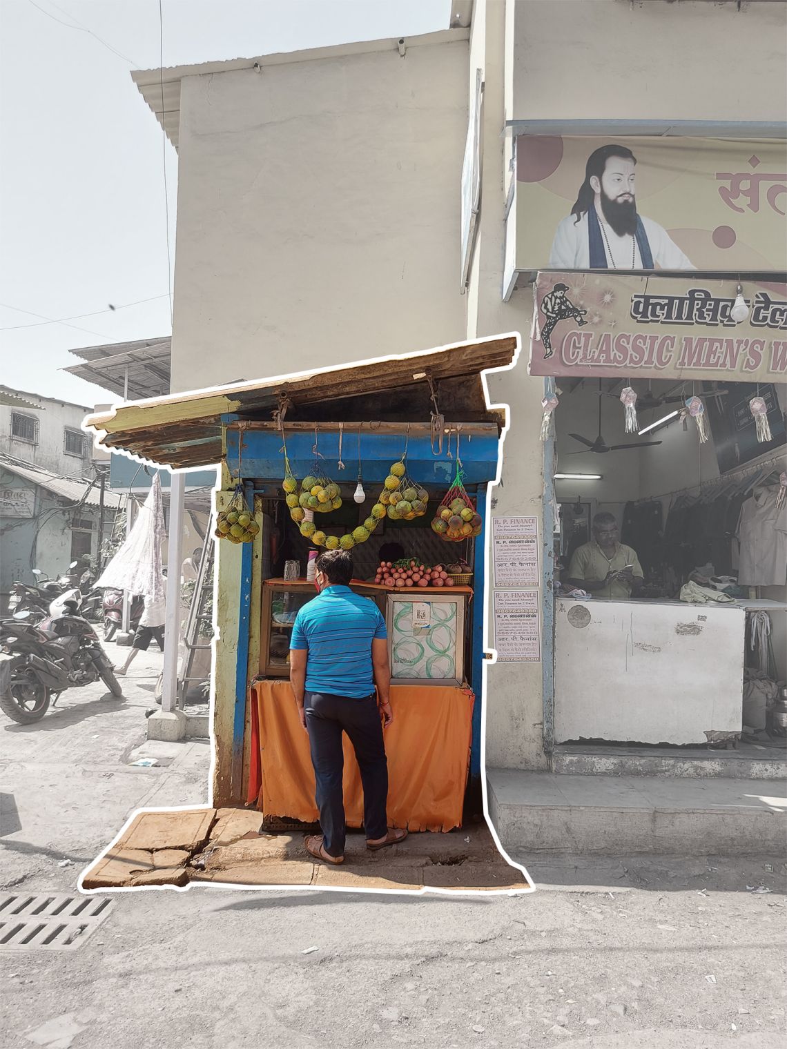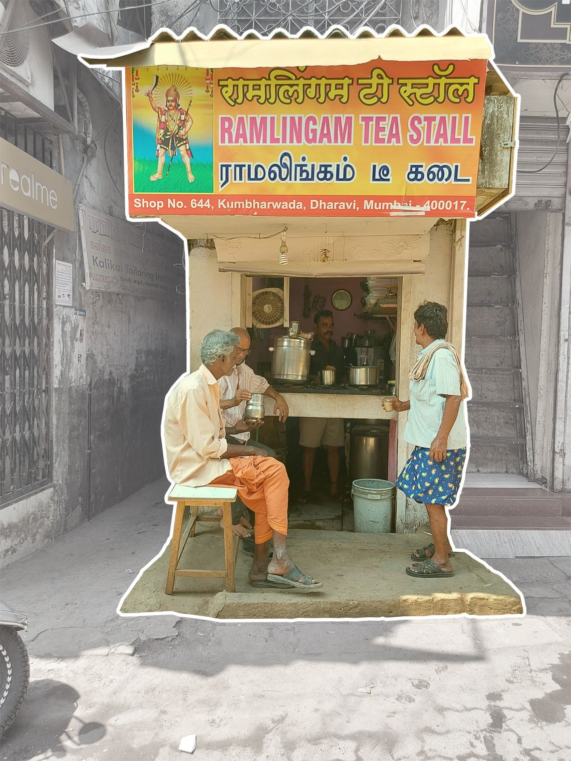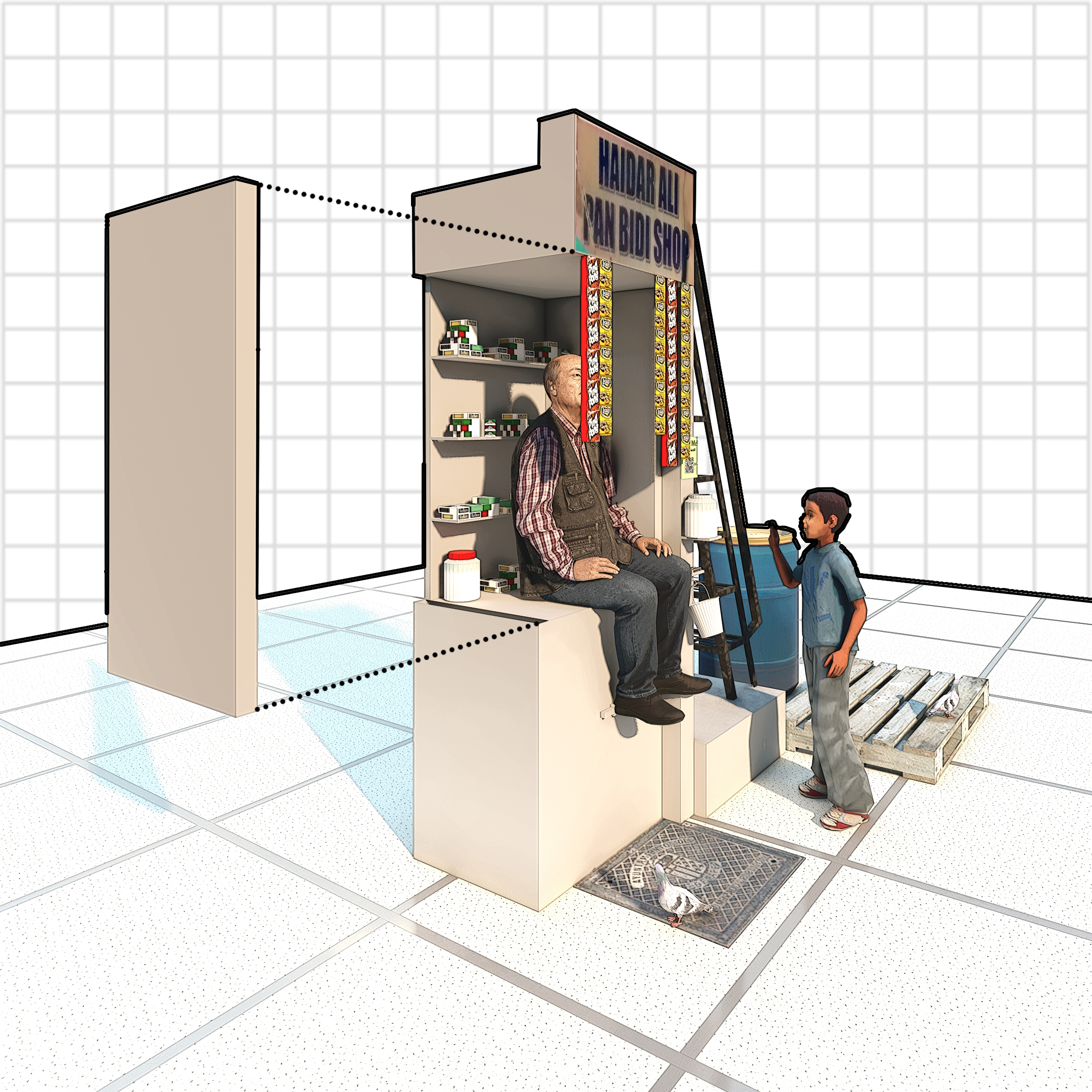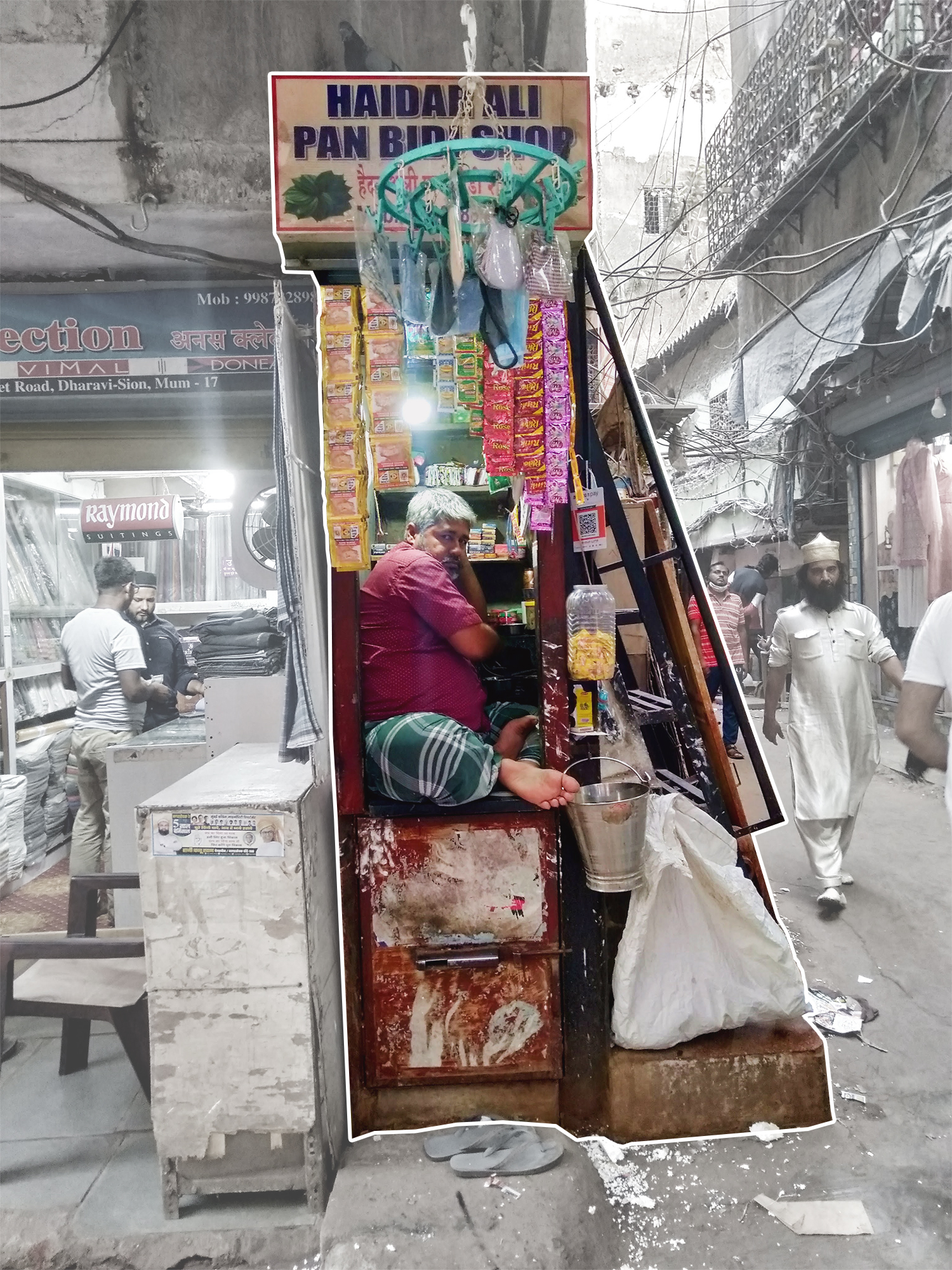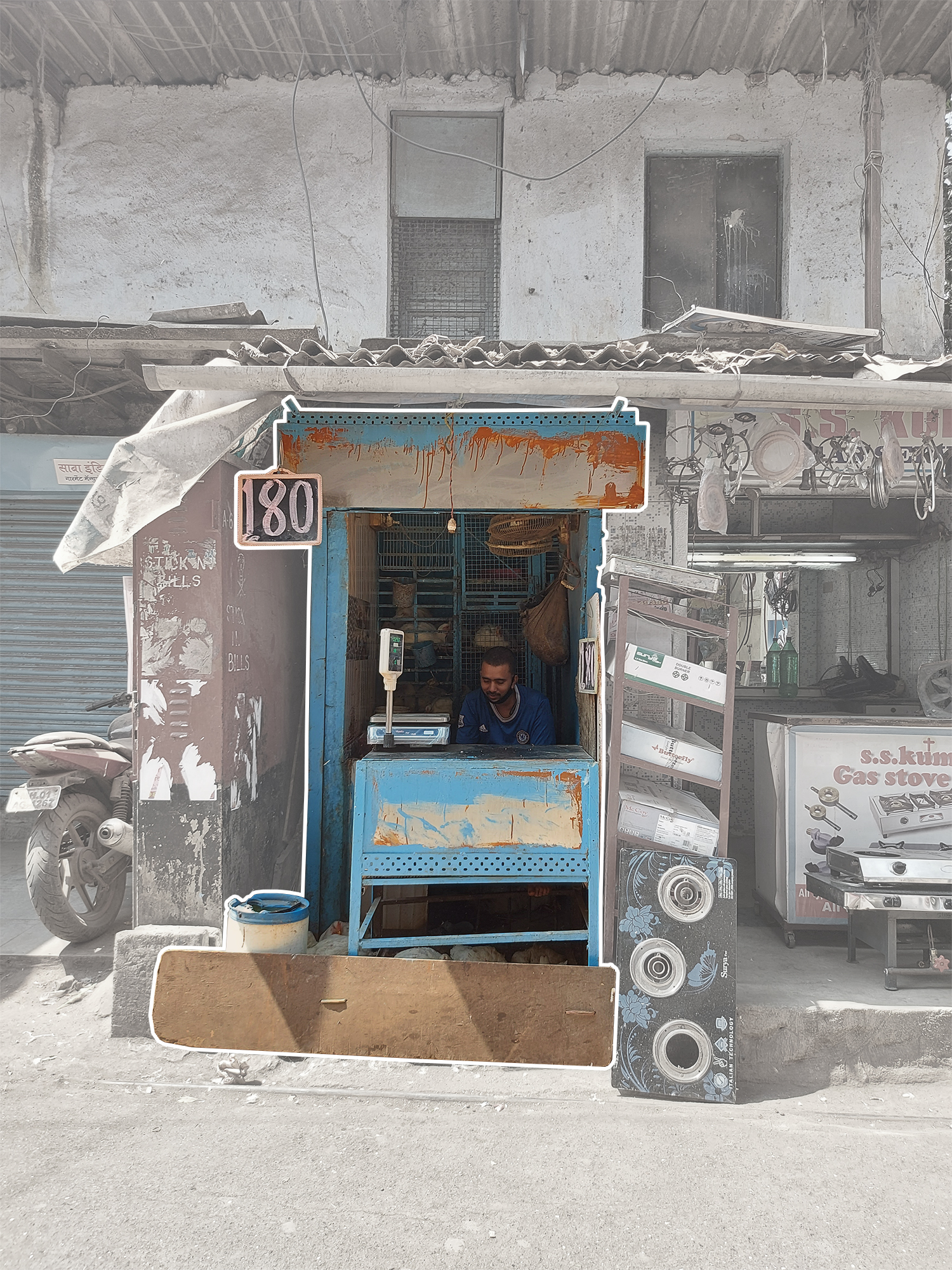 …is the diction commonly used to quantify a 3 feet x 3 feet space in Dharavi. What seems spatially redundant at first glance, is interestingly a commodity to the businesses thriving within Dharavi. Manifold businesses emerge out of a 3x3 feet footprint and cater to the diurnal requirements of the community. These self-taught space-management experts have managed to ‘fit in’ a fully functional tea stall, a grocery store, a chicken coop, a paan shop, a cobbler’s shop, a metal fabrication workshop, an electronics repair shop, and a clinic - all within 9 square feet of space.