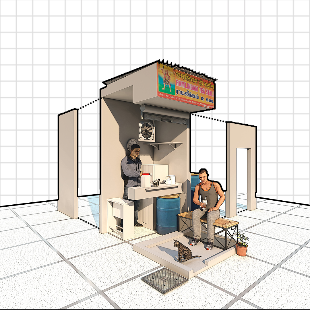 While Ahmed bhai’s shop effuses a serious work-oriented character to the street, Ramalingam’s tea stall provides an opportunity to pause and chat in the extension that it creates. Equipped with a sink, shelves, storage, exhaust fan, and a series of stoves, this brick and mortar tea stall adds a distinct character to the street. Here, spatial flexibility exists with respect to the different types of businesses the shop space can support. The existing tea stall may be replaced with a different function, thus enabling the same space to redefine the character it effuses onto the street. Collectively, these 3x3 shops dictate how people move, access services, and generate a distinct street culture.