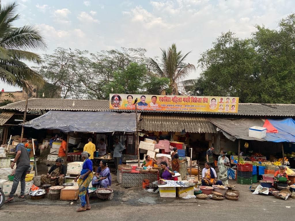 The thriving and vibrant fish market is located along the main access road of Diwale gaon. The space is an overwhelming sight of sellers, buyers, and all miscellaneous activities of any typical make-shift market space. The area in front of the market and on to the road has become a spillover zone for selling operations, creating vehicular bottlenecks. It is quite the scene! Chaos and disorganisation are becoming synonymous with the place due to inadequate waste management, seller and buyer waiting areas.