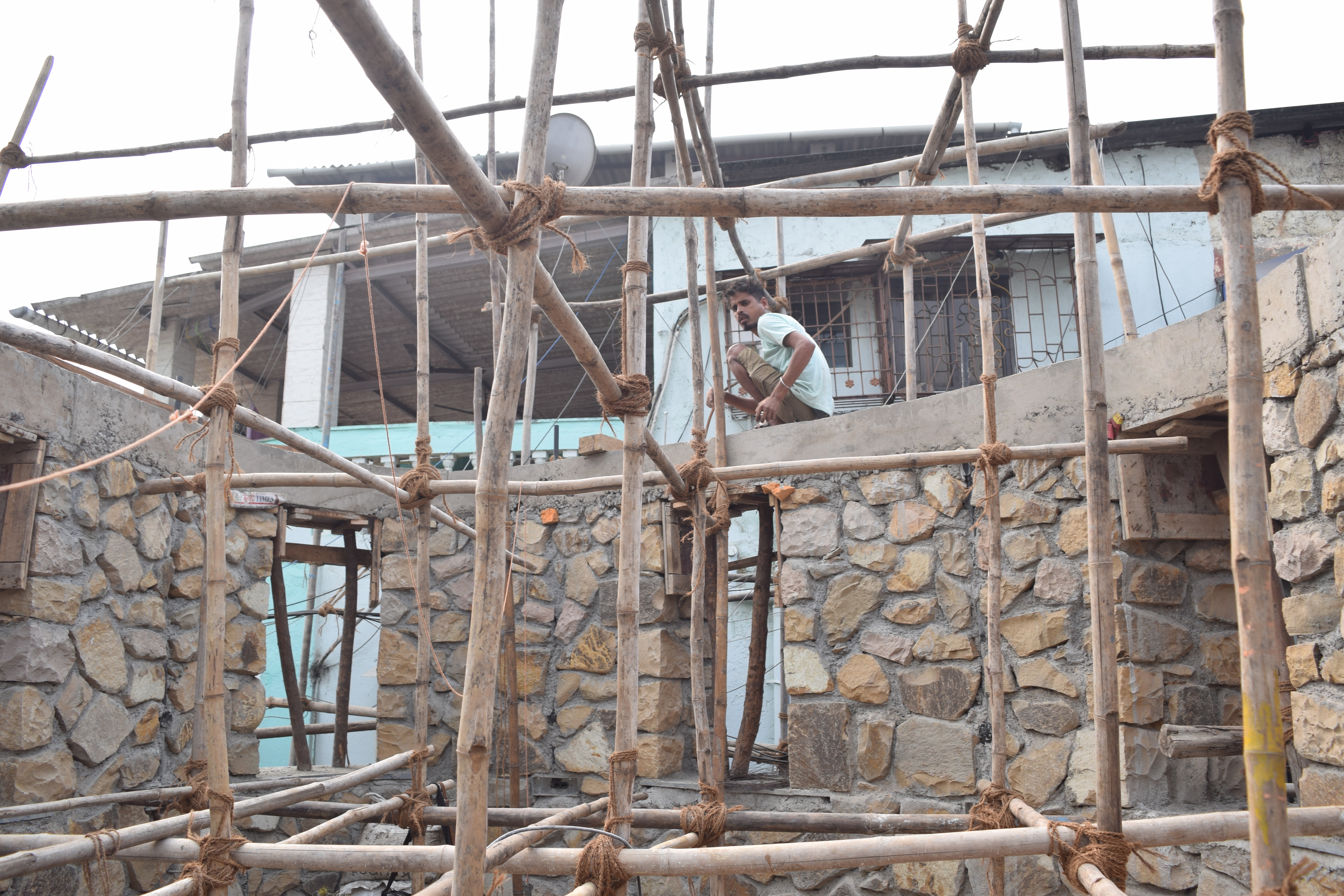 It has always been our practice to highlight the resources and skills of the contractors and artisans of Dharavi. The Kolis of Dharavi have adapted to alternate sources of livelihood and building construction is one of them. It was fitting that a local Koli contractor took care of the RCC and stone construction. He procured more salvaged stone from other sites around the city and found skilled stone masons, a tough task in Mumbai city. A young electrician duo from Koliwada did all the electrical work. The roof is being built by our friends from Design Jatra, who are specialists in vernacular architecture. The wood for the roof was sourced from a site 134 km away from Mumbai, the wood craftsmen come from villages in the same vicinity as the wood. Design Jatra also helped optimise the design of the pot tiles. The optimisation was needed to overcome certain drawbacks, which contributed to the decline of the Indian pot tile. But, weighing hugely in its favour is its superior performance over Mangalore tiles in reducing thermal heat gain.