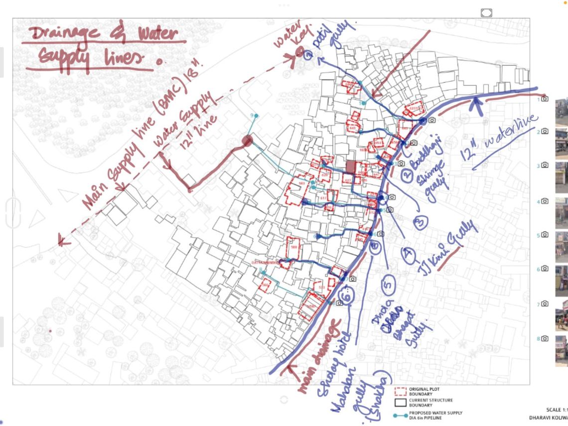 Cut to 2023, a group of 4-5 students while meandering on the streets of Dharavi during their initial observations showed immense interest to address the issues related to the distribution and management of water at a macro scale for the Koliwada community. The research was initiated by interviewing the president and ex-secretary of the Koli Jamat trust (a local council for the community) who gave us technical inputs on the precise locations of three main pipes from which individual pipelines branch out for all the houses. Regular digging of roads is common, each time a new pipeline is fixed or repaired. They added "Jamat manages the municipal valves which supply water to the entire Koliwada twice a day. The land belonging to this community has a history of just twelve houses originally in the vicinity to now accommodate three thousand tenants post 2008 with a decline in major economic activities like alcohol production and trading of fish.” The current population of Koliwada is estimated at 8000 persons with almost 400 hundred families. According to a local resident, “Hundreds of water pipelines run in channels sandwiched between layers of bitumen poured over decades.