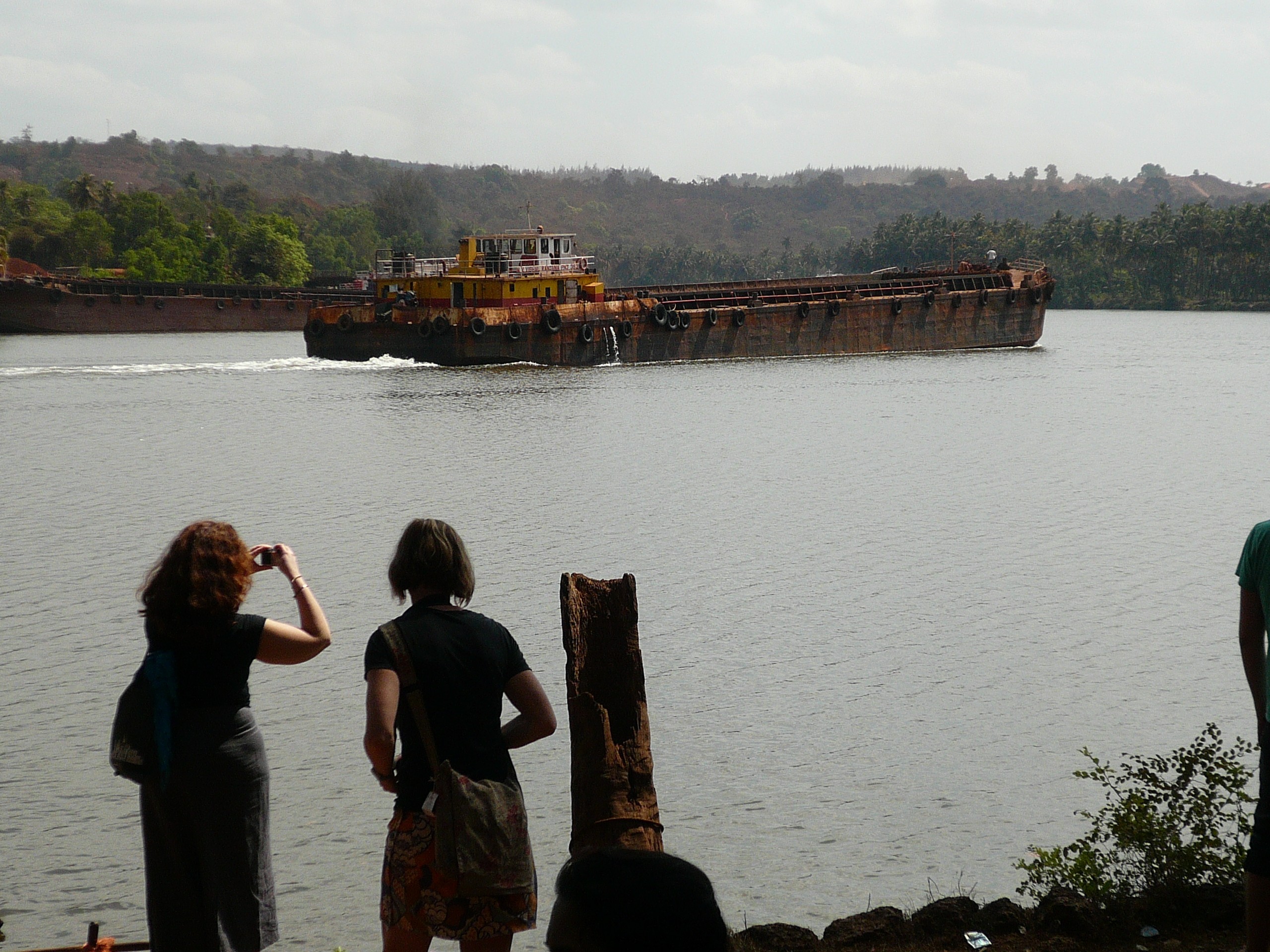Two students of the Royal Institute of Arts taking pictures of a barge transporting Iron ore on the Mandovi river