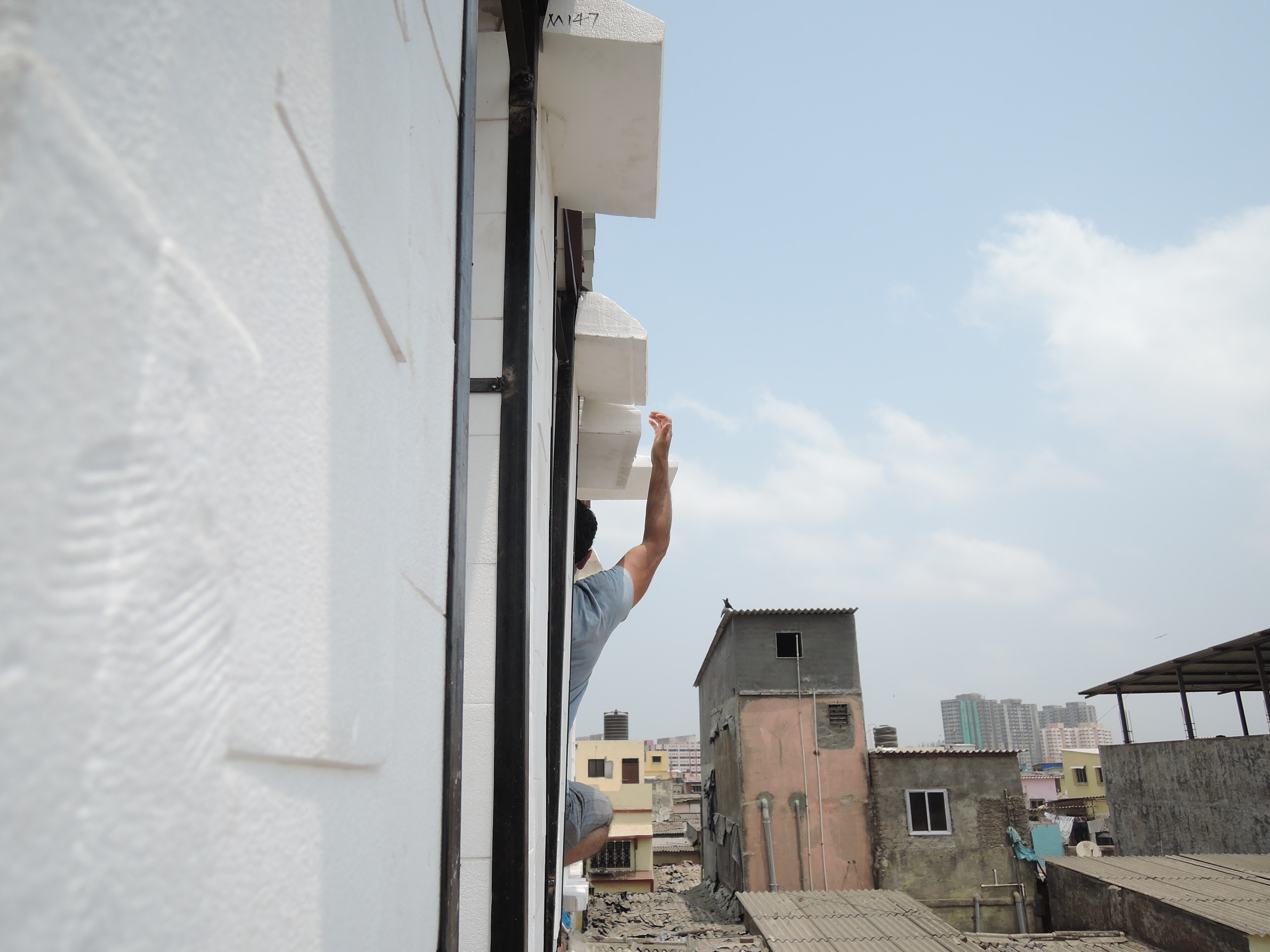 While initially planning our move, we had the opportunity to work with Anton Garcia and Debora Mesa of (POP Lab at MIT) on our collaboration for the exhibition at MoMA, New York. At that time we had toyed with the idea of working with a material they had been experimenting with – EPS. We were initially sceptical about the potential of using this material in Mumbai. It is light and can take pretty much any shape, but it is also relatively expensive compared to conventional construction materials used in homegrown neighbourhoods. It is also not environmentally friendly.However, we decided to test it for ourselves by using it for the new office.