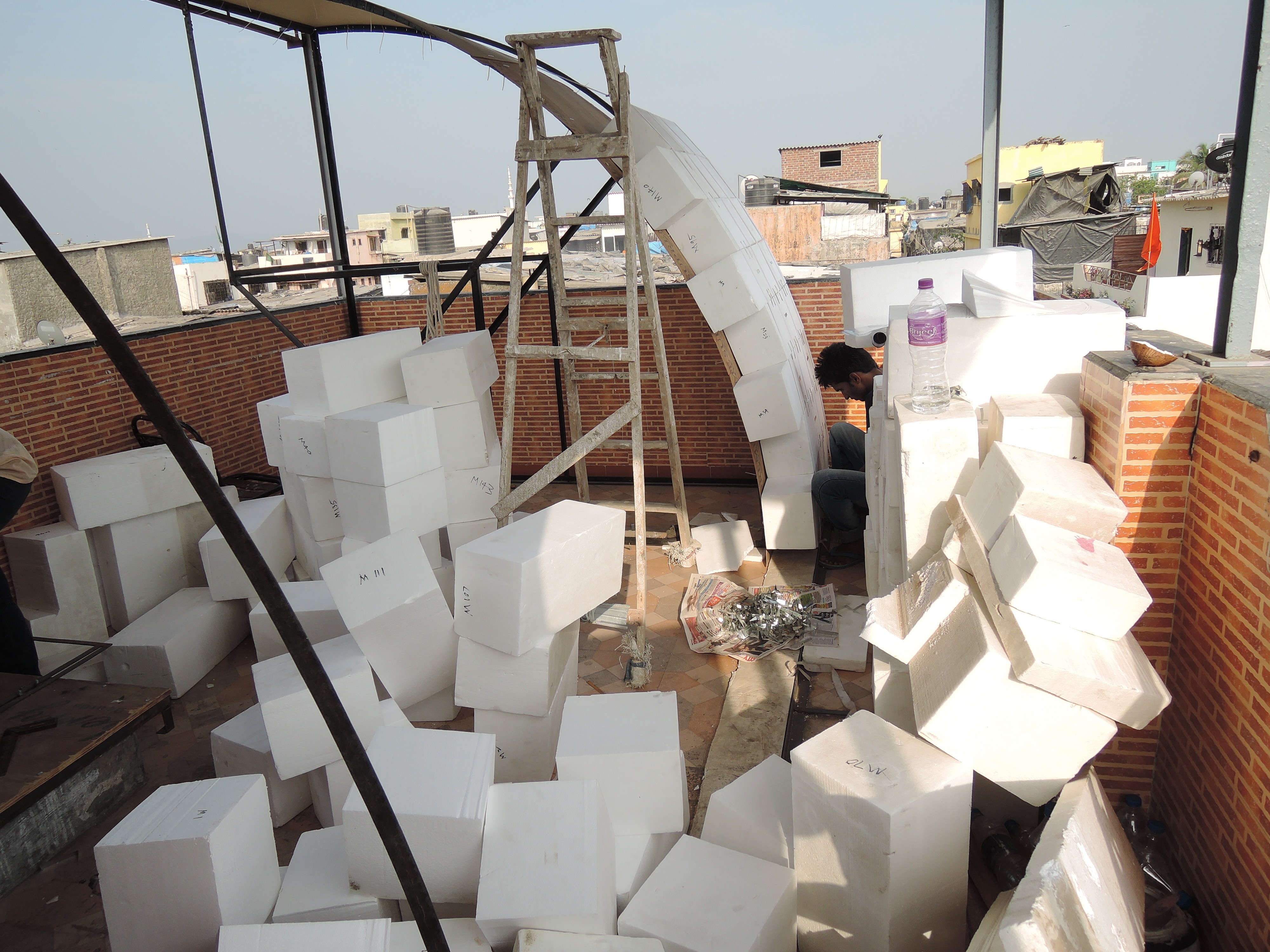 Many weeks of discussions and experimentation between the urbz team, lead by Shardul Patil and Jai Bhadgaonkar, and our collaborators from sP+a, a cutting edge architecture studio in Mumbai, resulted in the final form of  the structure. A half-igloo vaulted shape, held together by a steel frame with accurate measurements calculated for individually cut blocks that would interlock and hold.