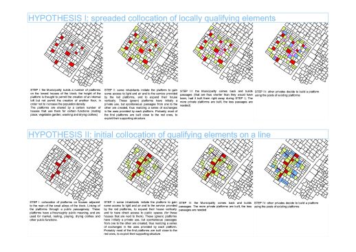In the first hypothesis, the initial platforms built by the Municipality are a kind of neighborhood space, as they serve a certain amount of houses for a certain amount of semi-private purposes, like manufacturing, hanging clothes, etc, while the actual owner of the house has the advantage that his house received an additional loft space beneath the platform. As the building of the platforms spreads, more and more houses have them and the ratio of open space grows. At his point, it can go either way: if the platforms have assumed a private use, meaning that each household tends to use their own and not go onto the others, the process can stop here. If, on the other hand (and we think it would happen this way), the platforms are used more “publicly”, as walkways, as selling points for hawkers, as markets, then the Municipality would decide to come back and install safe passageways between one and the other (Step III).
