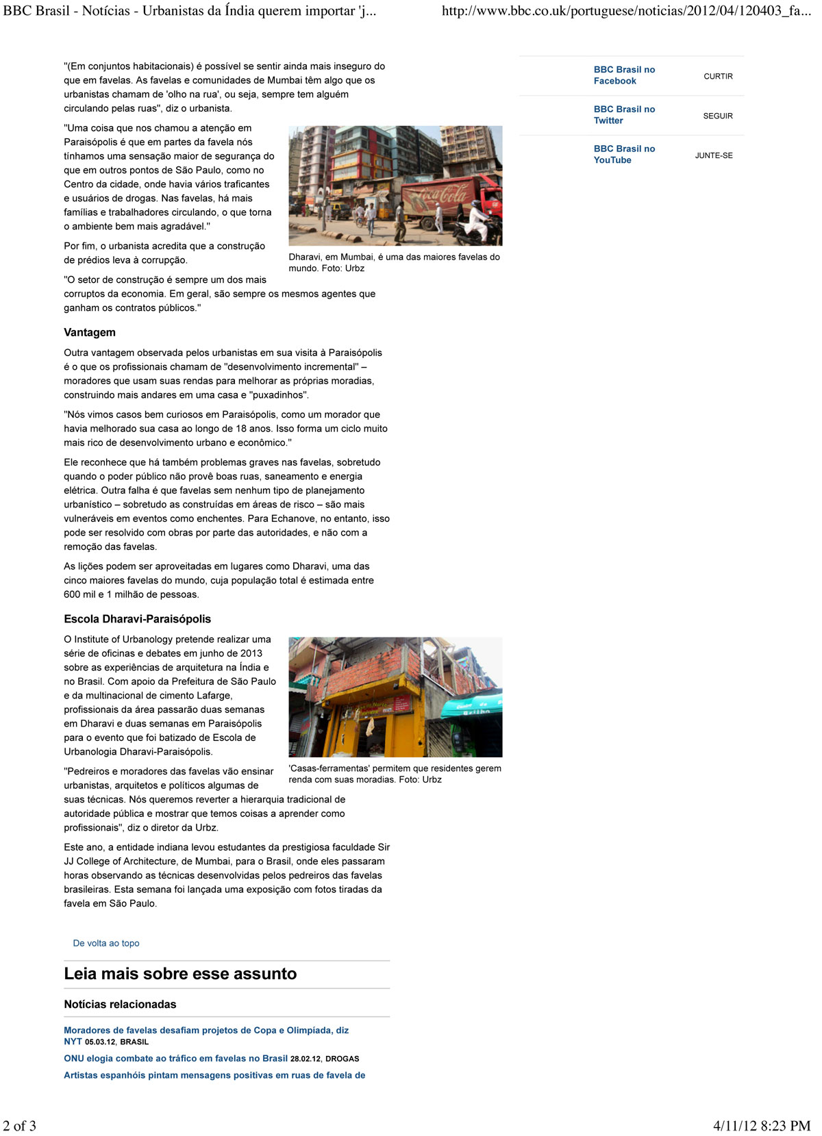 The Institute of Urbanology plans a series of workshops and discussions in June 2013 on the experiences of architecture in India and Brazil. With support of the City of Sao Paulo and the multinational Lafarge, professionals will in two weeks and two weeks in Dharavi Paraisópolis for the event which was named Dharavi-Paraisópolis Institute of Urbanology.