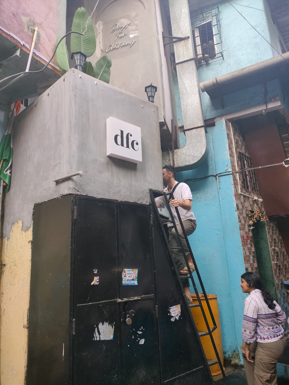 A small sign stands out along Ganesh Temple Road, in the heart of Dharavi, Days for Clothing (DFC). Tucked away on the first floor of a modest tool-house, the store reveals itself as a carefully curated streetwear boutique. As you browse the racks, it’s hard to miss the bold neon-green tag on every piece, proudly declaring, “Made in Dharavi.”