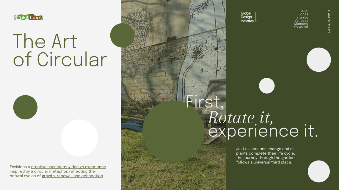 NeuLand is a community garden in Cologne: a successful urban farming project in need of attracting a larger community, especially since its recent re-location to a new site. The six GDI students (Jonas, Kryzsztof, Vanessa, Stanley, Momodo, Beilei) who worked on NeuLand paid a lot of attention to the idea of circularity at every level of their engagement. Inspired by the circularity of seasons and agriculture, and by the uniqueness of the “round table” – around which exchange and interaction happen in a more dynamic form than elsewhere –, they saw the potential for the garden as a centering space in its neighborhood, that invites everyone in.