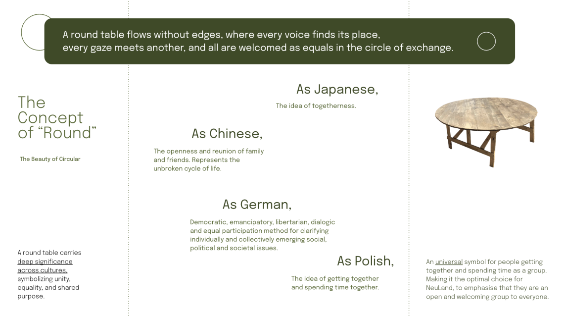 _A round table – a symbol of conviviality, togetherness, and equality across many different cultures – which can mark the entry into NeuLand. Visible from the entrance, the table embodies and hosts spontaneous convivial encounters, open to both, NeuLand members and newcomers. Anyone can sit, chat, and participate, even without prior farming knowledge or curiosity.
