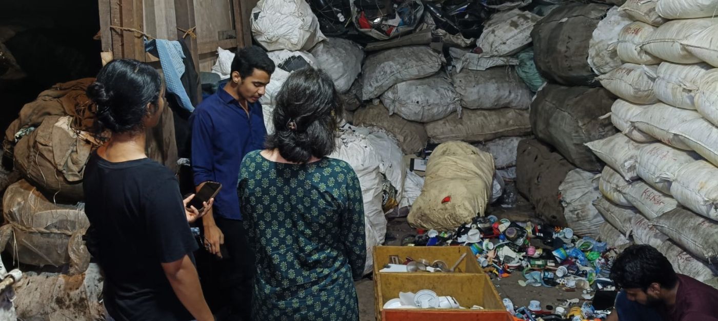 The thick, humid monsoon air clung to us as we made our way to The Plastic Yard, a recycling unit alive with machinery, nestled between the damp lanes and buzzing markets in the 13th compound off Dharavi’s 60 Feet Road. The 13th Compound, known for being a hub of informal recycling of plastic and metal, branches into endless veins of tempos overflowing with waste collected from the city, and godowns churning with heavy crushers. The narrow lanes led to snack shops and workers humming old Bollywood songs, the roofs dripping in the monsoon with a mixed waft of biryani and metals. Unlike the streets of other neighbourhoods, there were spaces where time moved either too quickly or too sluggishly; the crushers rattling 5 tons of plastic and workers humming songs while sorting materials formed a strong contrast.