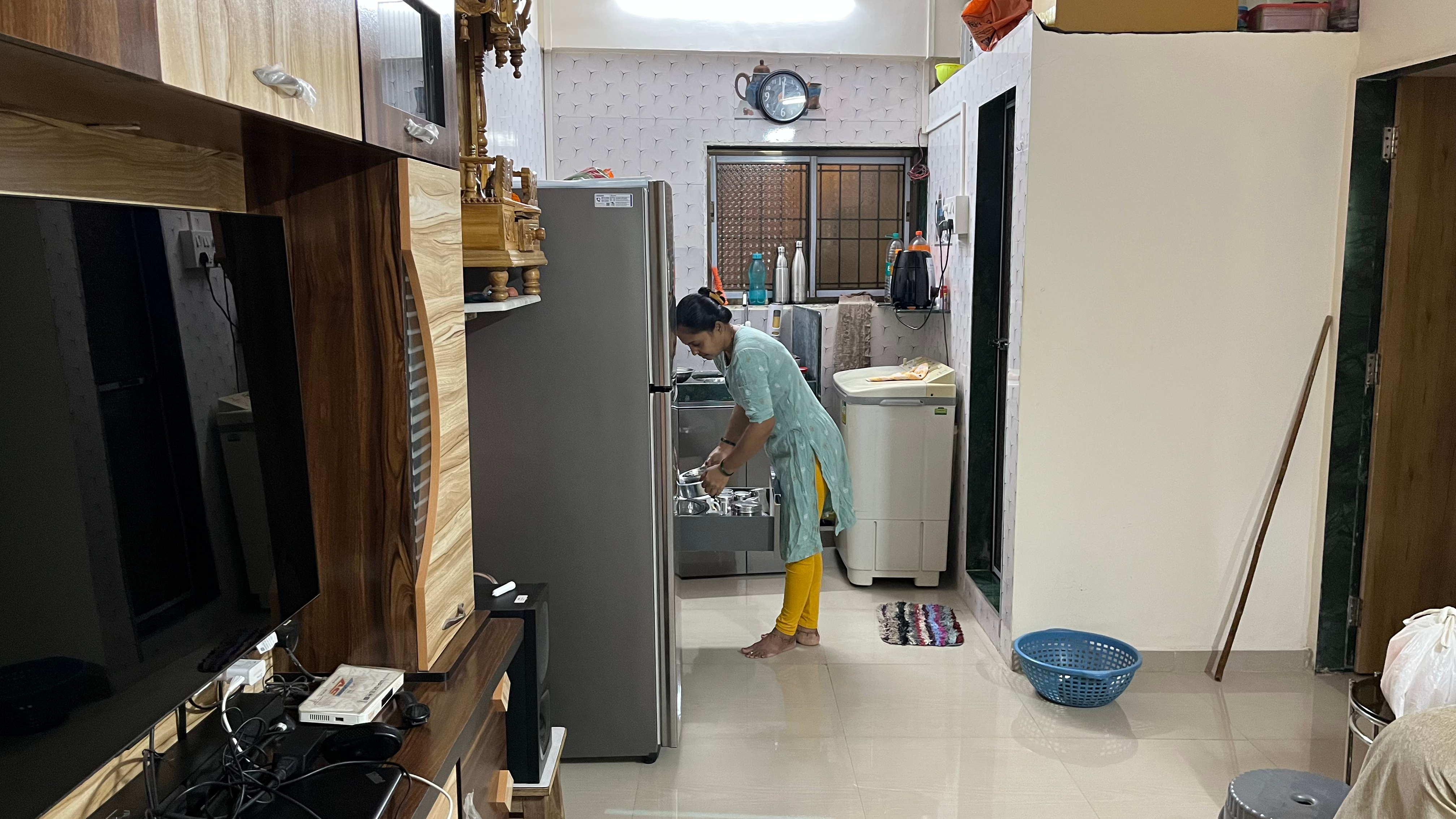 First, we visited the home of Mahesh Manoj, who told us he had lived in the chawl since it was first renovated in the early 2000s. He exclaimed that the size of his residence had decreased. However, when we compared the original chawl layout with the updated one, we found that the square footage he was given was the same as before, even though the new design had rectangular or L-shaped rooms instead. Perceptions of space and its various arrangements provided a starting point for the discussion that this example sparked. While describing the building's enclosed design, he commented, "Very nice overall, although we don't always achieve the required network. The connection frequently drops, especially during team videoconferencing."