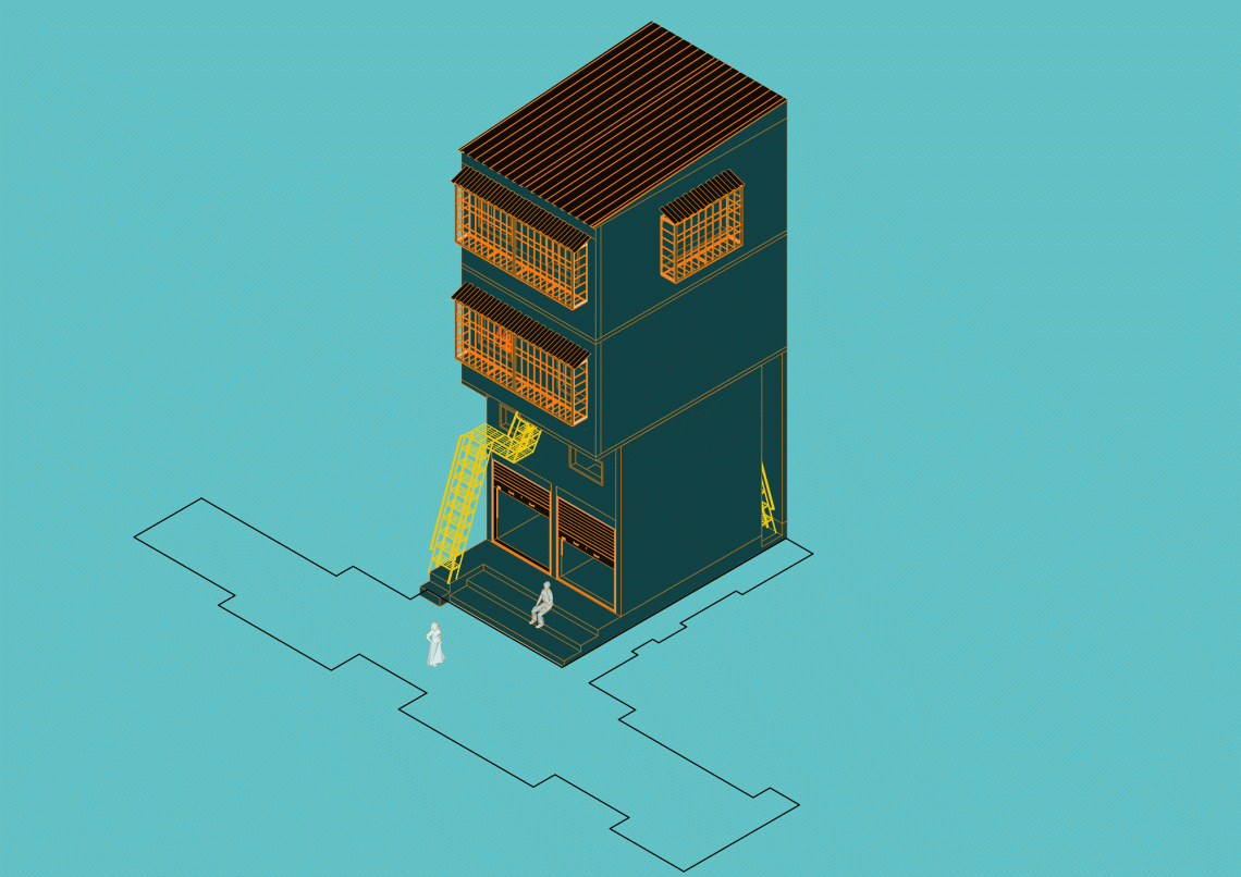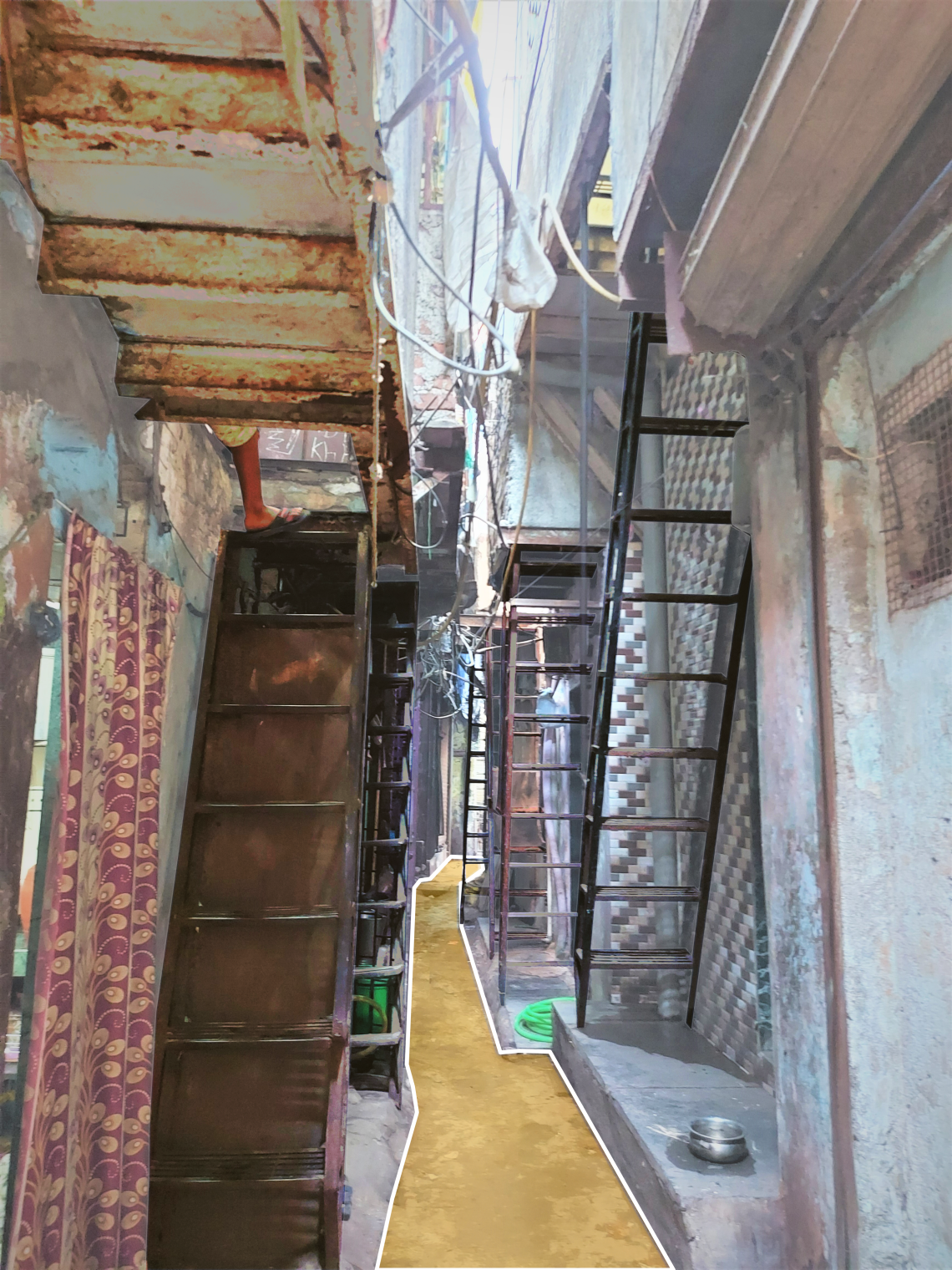 A convoy of mild steel staircases dots the dynamic gullies of Dharavi. As one of the most essential Homegrown elements, these staircases are a direct indication of the vertically incremental developments in this context. Primarily installed as an ‘add-on’ for the additionally constructed storey, these staircases have become a natural part of the street to guide one to ‘the way up.’