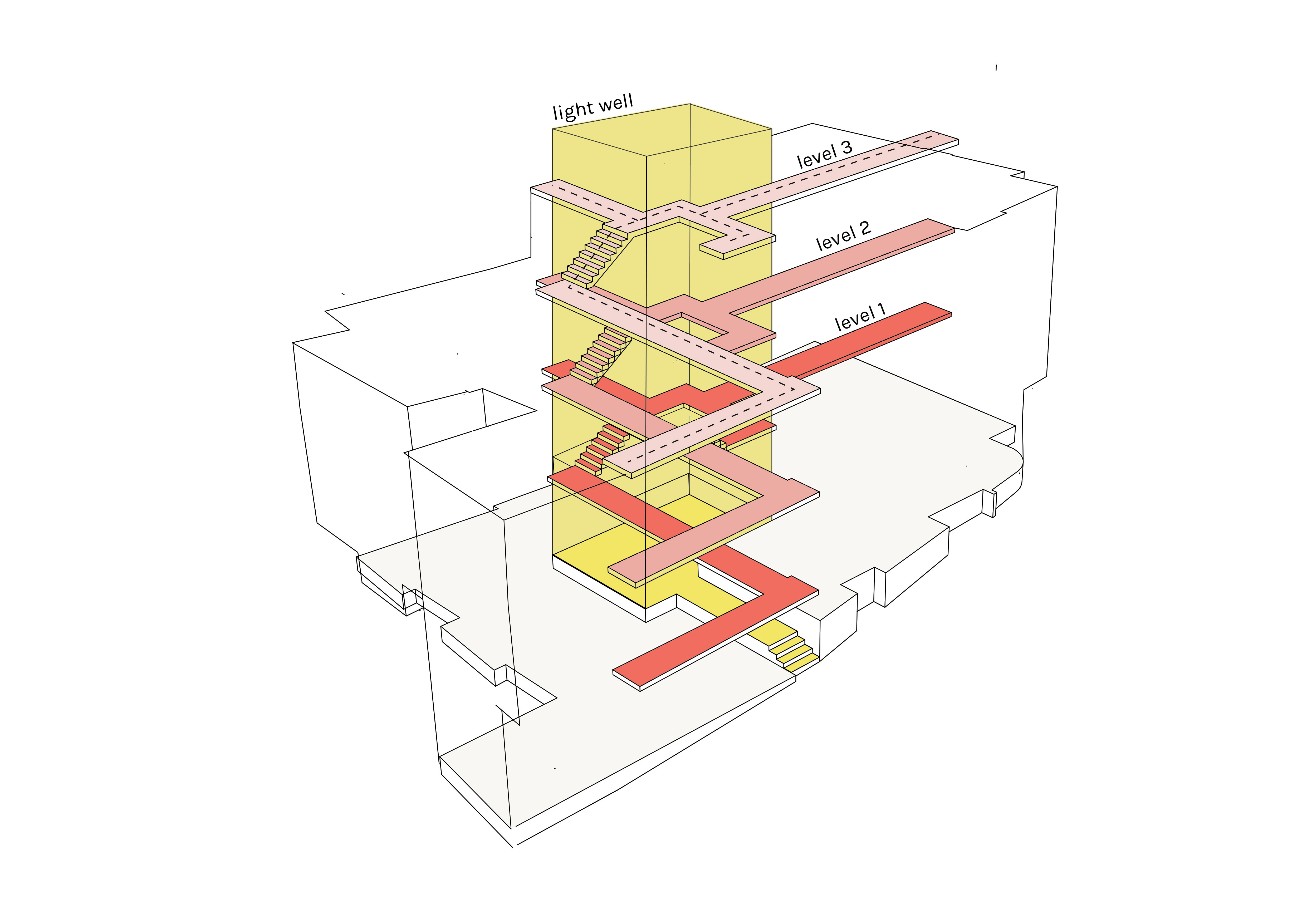 In the proposed design the staircase is wrapped around a light-well, improving the quality of light, ventilation and circulation. Along with optimising space, this gives the impression of a wider opening for the light-well. The staircase also doubles up as a corridor, the landings giving access to some units on the first and second floor. The light-well will bring adequate light to the ground floor where a chowk (common space) is planned. We hope that the well lit chowk (common space) will provide a sense of safety and encourage women to use it.