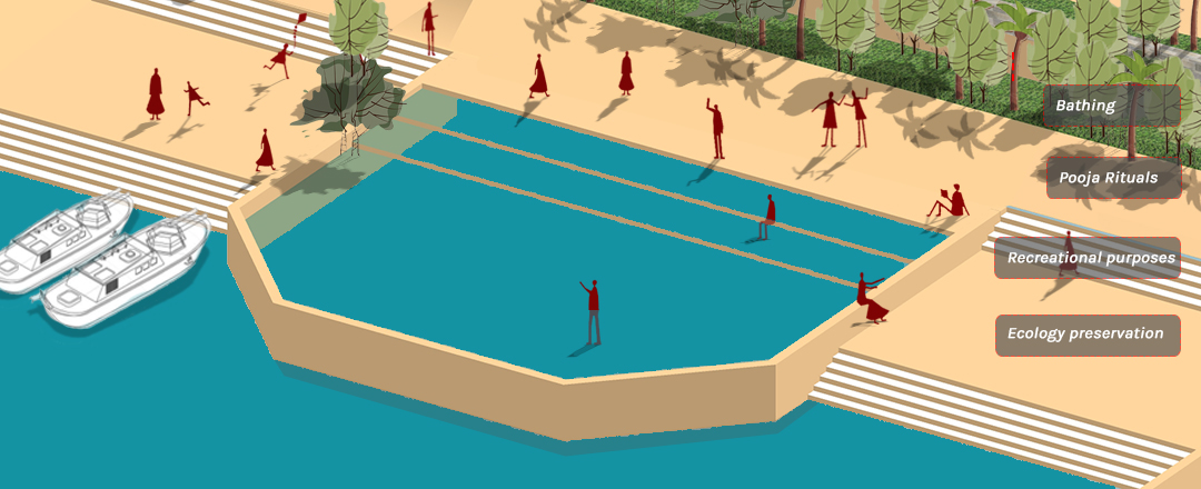 With the words of wisdom passed from generation to generation discussed at otlas, Narayan Koli says that large amounts of puja rituals leftovers, coconut offerings, waste materials, ashes are being dumped into the sea, which has a direct impact on the area's ecology. His childhood friend Vasudev added that – due to pollution and urbanisation, the reduction in fish capture has impacted on their income, their lives, and also affected their health. “The modern education system, where our children study, has changed our daily way of living and all has gone for a toss with reference to our way of living during our childhood days.” Being in talks and comprehending the retention ponds built in Navi Mumbai, we came up with a proposal for providing a public place where residents can wash, worship, and make offerings as per their beliefs.  This promenade would function as a barrier and a filtering system from the main creek, which would help conserve and sustain the biodiversity of the place.