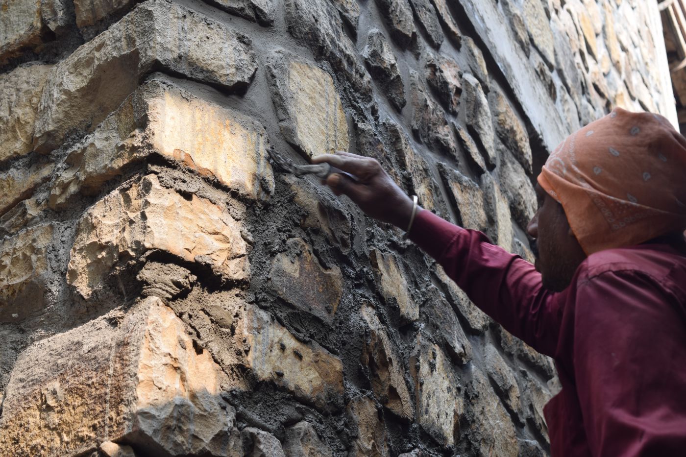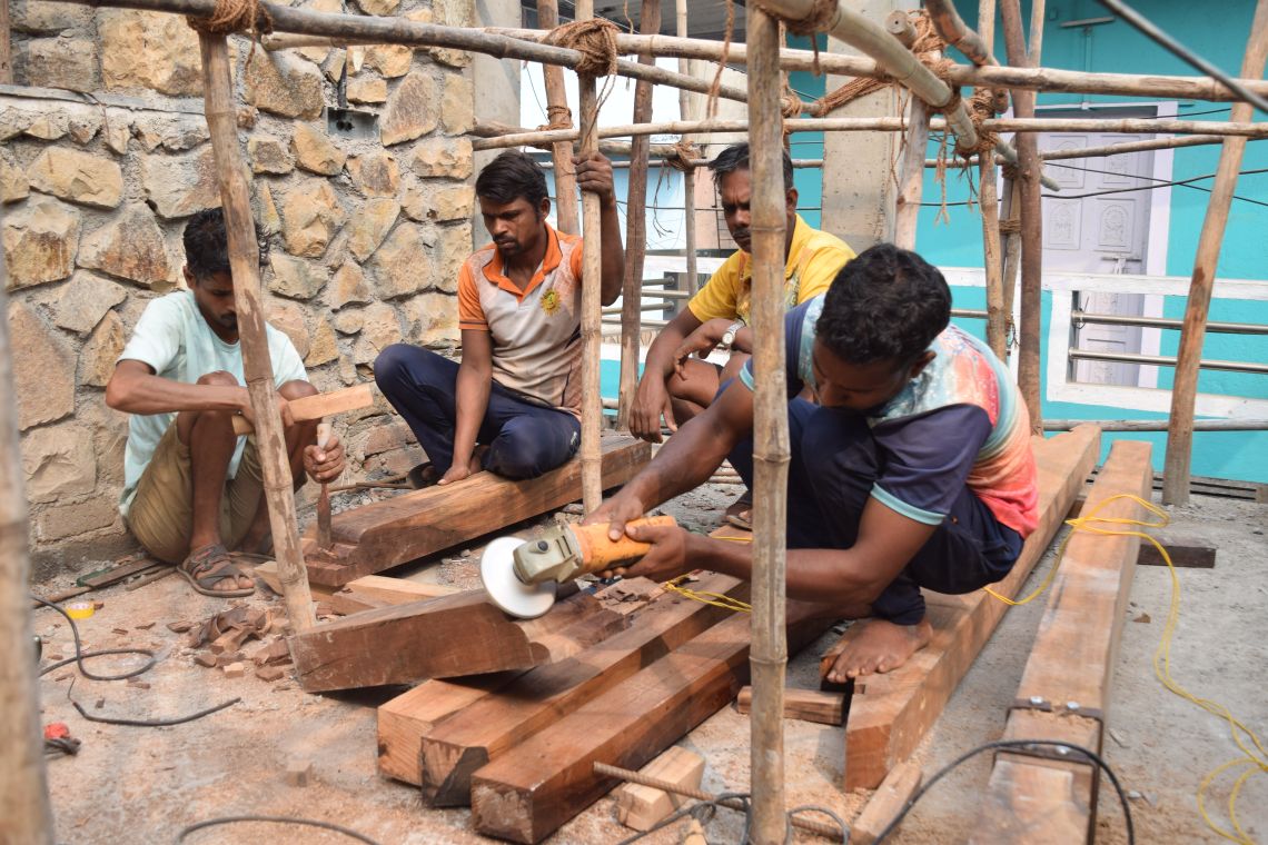 It has always been our practice to highlight the resources and skills of the contractors and artisans of Dharavi. The Kolis of Dharavi have adapted to alternate sources of livelihood and building construction is one of them. It was fitting that a local Koli contractor took care of the RCC and stone construction. He procured more salvaged stone from other sites around the city and found skilled stone masons, a tough task in Mumbai city. A young electrician duo from Koliwada did all the electrical work. The roof is being built by our friends from Design Jatra, who are specialists in vernacular architecture. The wood for the roof was sourced from a site 134 km away from Mumbai, the wood craftsmen come from villages in the same vicinity as the wood. Design Jatra also helped optimise the design of the pot tiles. The optimisation was needed to overcome certain drawbacks, which contributed to the decline of the Indian pot tile. But, weighing hugely in its favour is its superior performance over Mangalore tiles in reducing thermal heat gain.