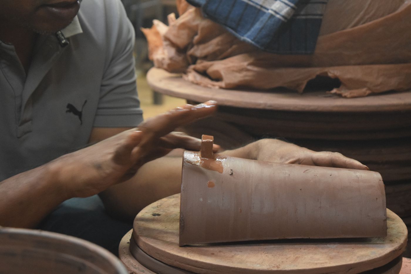 The diversity of hands-on skills available in Dharavi has always inspired and impressed us. As architects experimenting with pot tiles, we couldn’t be more lucky to have Kumbharwada - a potters' village - within a walking radius of our site. Our long-time collaborator, Abbas Galwani, is a potter with a thriving practice in the heart of Kumbharwada. It was a no-brainer to approach him for the task at hand. After several attempts at optimisation, we collectively designed a pot tile that we hope could revive its use. As we write this, 15000 pot tiles are being meticulously handmade and fired in the kilns of Kumbharwada, Dharavi.