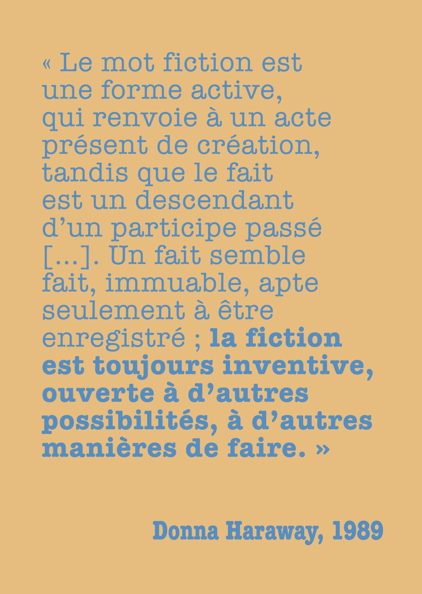 This convinces us of what Donna Haraway has suggested (which we heartily endorse) the word fiction is an active form, referring to a present act of fashioning, while fact is a descendant of a past participle, a word form which masks the generative deed or performance. A fact seems done, unchangeable, fit only to be recorded; fiction seems always inventive, open to other possibilities, other fashionings (Haraway 1989: 4)