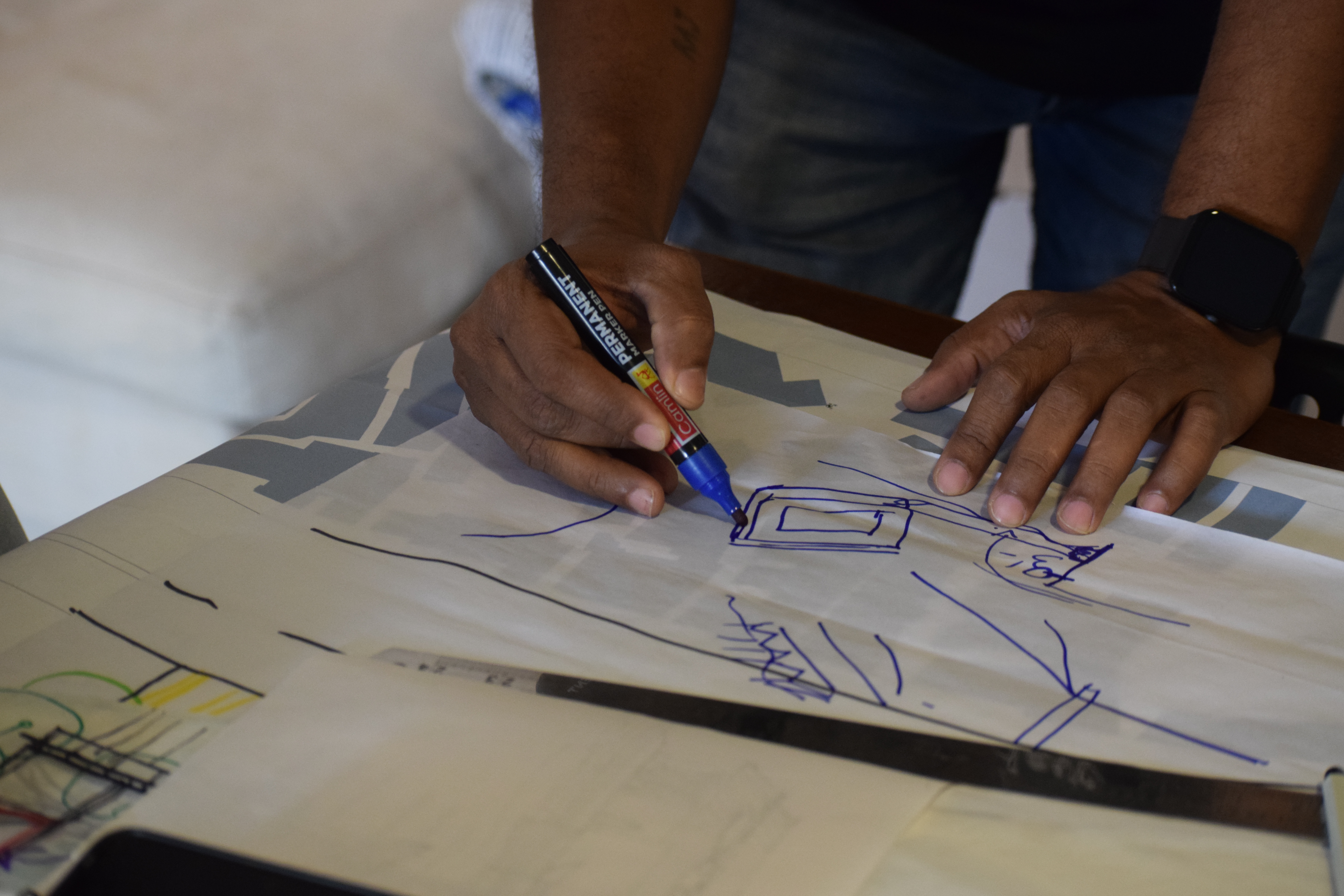 Chandna and Jyotsna Maushi (Aunty) from the self-help groups were eager to have a place where they could sell Koli delicacies. The women collectively run a catering service and want a dedicated location to cater to people from Koliwada and the rest of the city. The women helped to conceptualise food stalls along the street-facing edge of the site. Domnik Kini, president of the Dharavi Koli Jamat, is trying to adapt the existing stage on site to create facilities for fish processing.