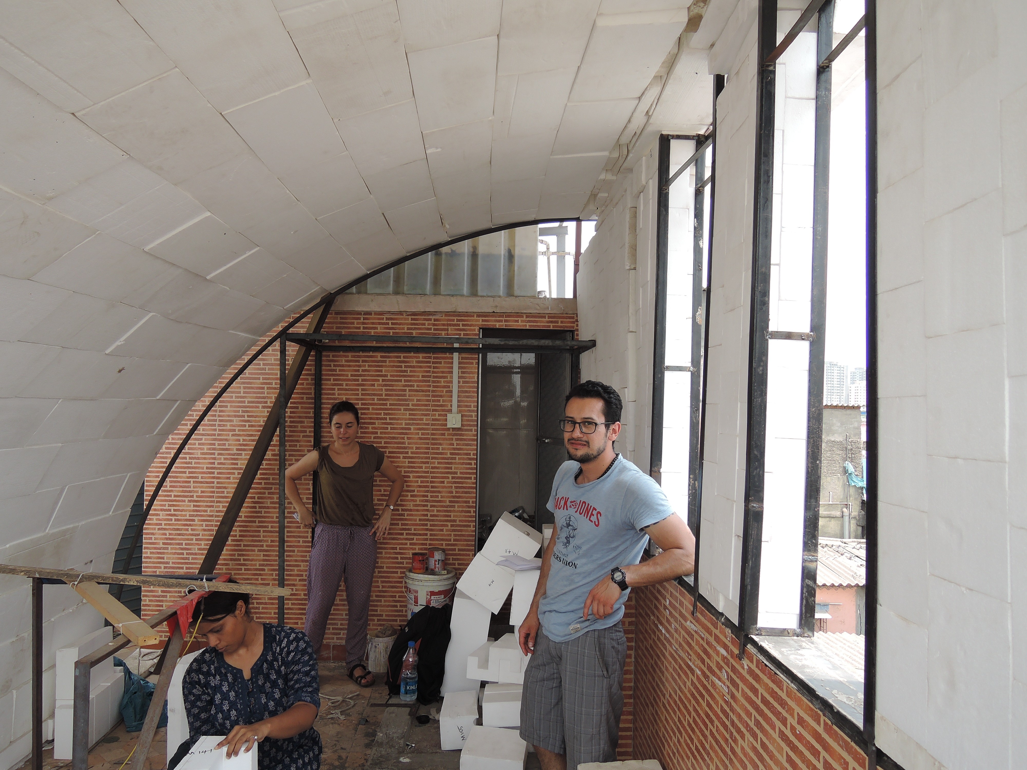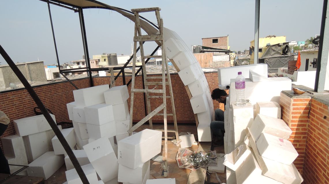 While initially planning our move, we had the opportunity to work with Anton Garcia and Debora Mesa of (POP Lab at MIT) on our collaboration for the exhibition at MoMA, New York. At that time we had toyed with the idea of working with a material they had been experimenting with – EPS. We were initially sceptical about the potential of using this material in Mumbai. It is light and can take pretty much any shape, but it is also relatively expensive compared to conventional construction materials used in homegrown neighbourhoods. It is also not environmentally friendly.However, we decided to test it for ourselves by using it for the new office.
