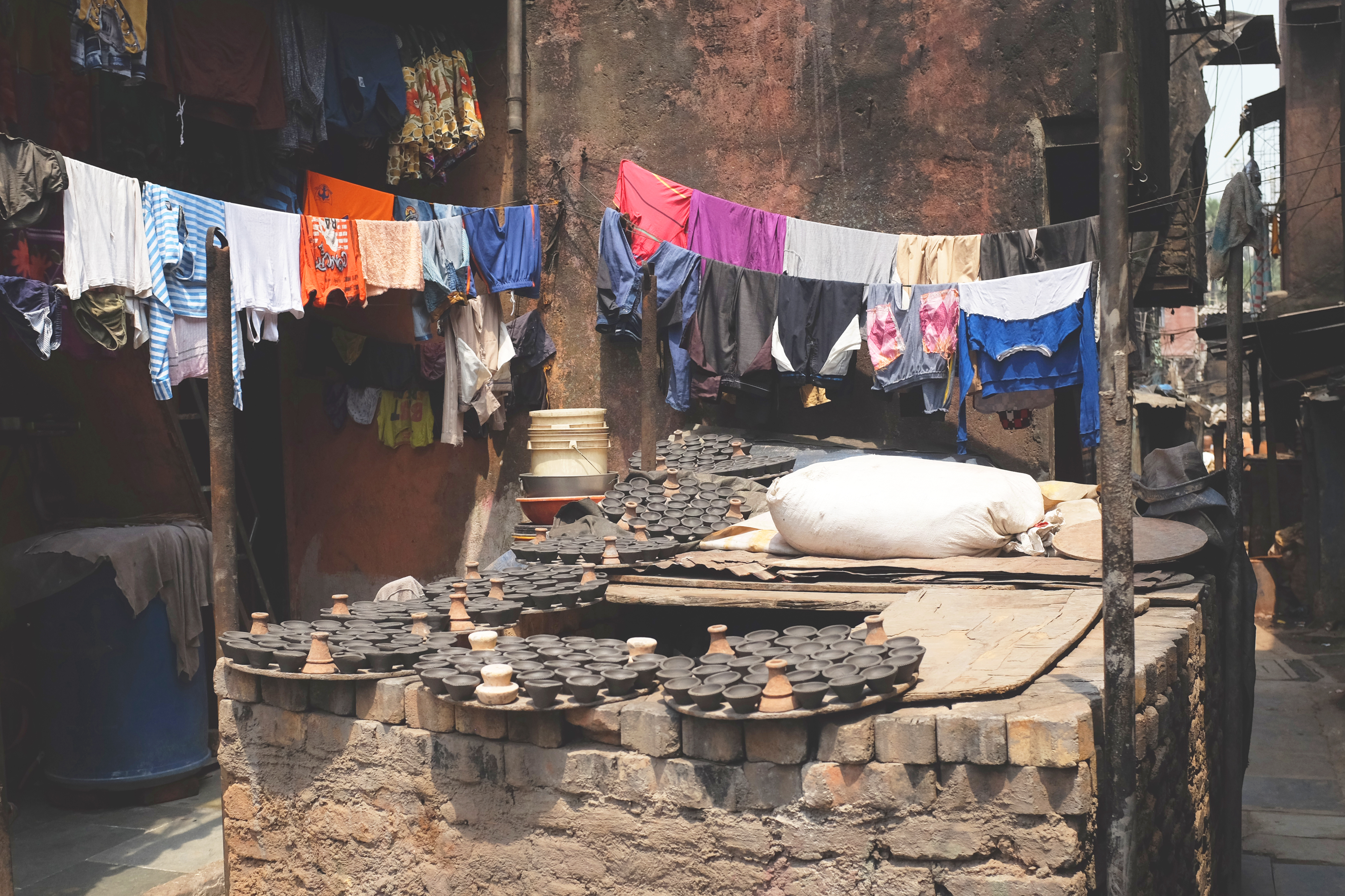 Kumbharwada is one of the first settlements in Dharavi, built by migrants from Gujarat in the second half of the 19th Century. It’s home to the pottery industry, one of Dharavi's most famous local crafts. In the small gaps between their houses, artisans throw and fire pots of all shapes and sizes, from small cups for yoghurt to diya candles, larger water pots or ornamental vases. The potters brought their family trade with them, and maintain – like many in Mumbai – strong ties to their ancestral villages. They’re in constant communication (physical and online) with their families in the North, collaborating to improve kiln designs, visiting their villages regularly, and significantly, importing their clay from there.