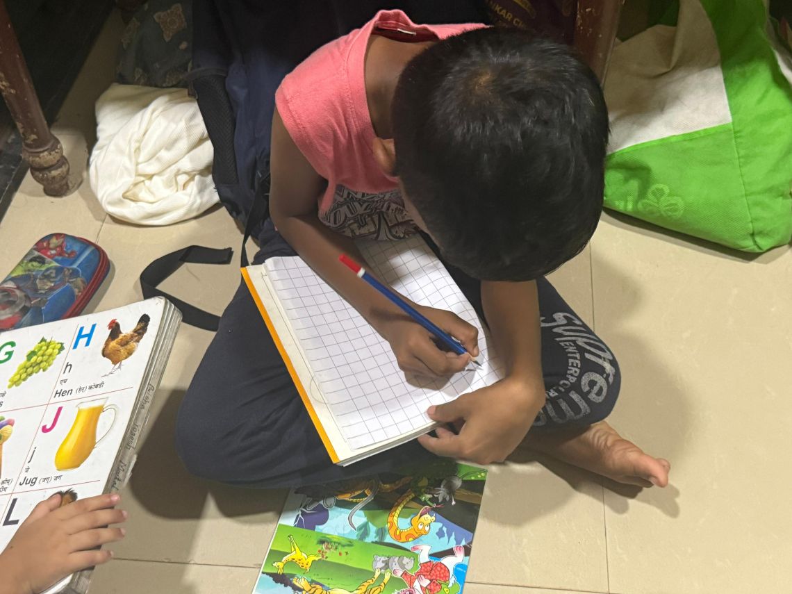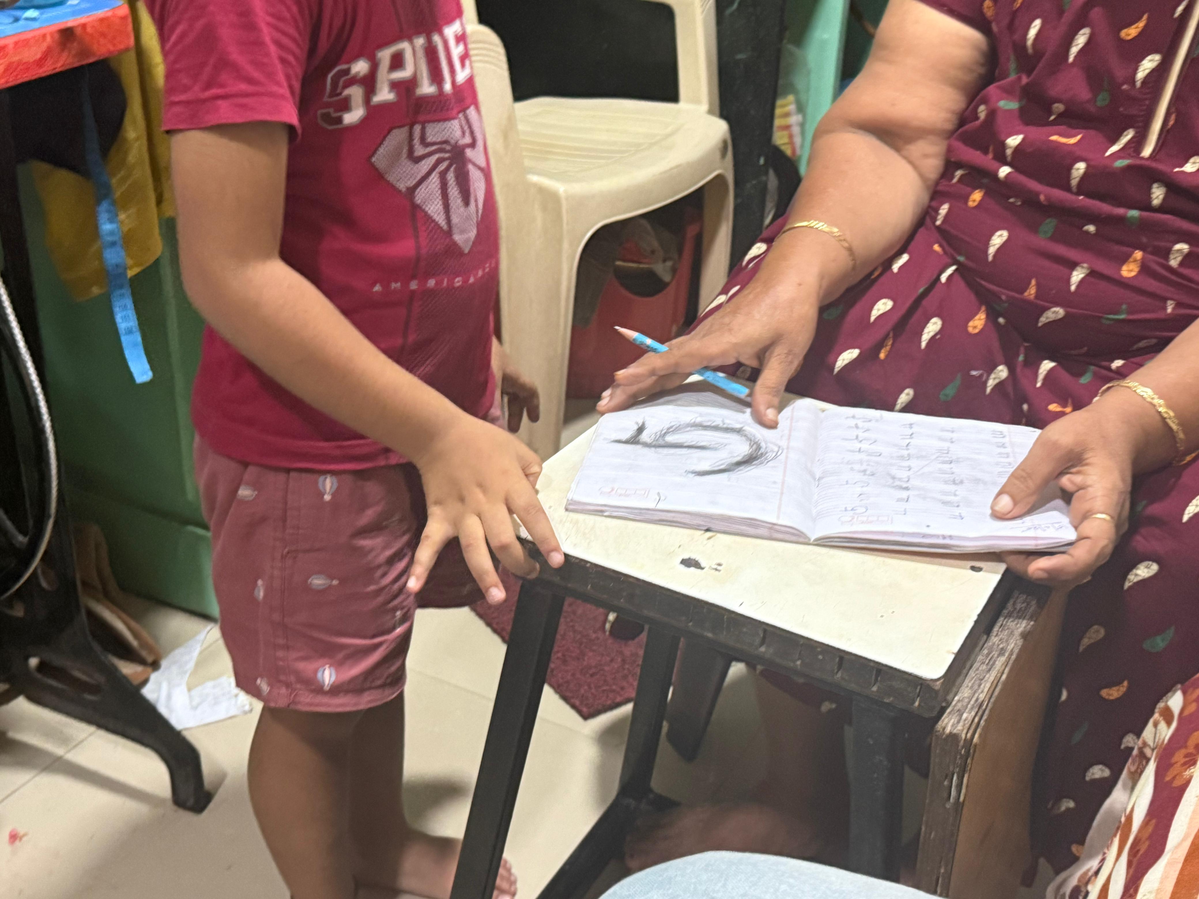 Her house is a small hub of neighbours stopping by and children’s laughter spilling from the walls. Her day begins at 4 AM with a prayer, a hot cup of tea, and a list of chores she ticks off before her students arrive. Evenings find her helping children with homework or teaching English or math to parents who never had a chance to learn. In her afternoon hours, she volunteers at a women's empowerment organisation just outside her lane. She finds time for sewing, small repairs, and even knitting, never letting her hands rest idle.