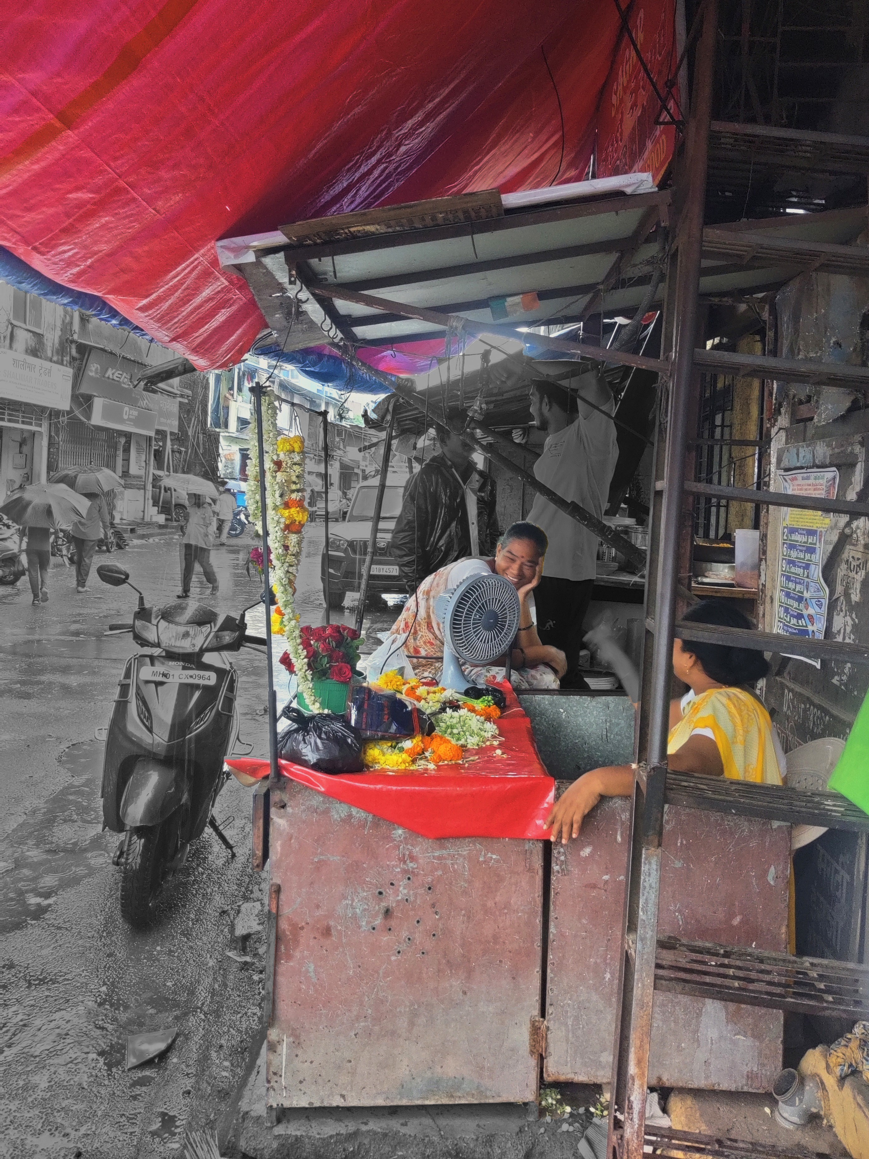 In Dharavi, these structures are set up at irregular intervals, on footpaths as well as on the roads- some directly attached to the fronts of shops while others are disjointed from permanent structures. Even the sizes of these establishments vary, where the latter kinds are usually larger and made of more durable and hardy materials such as bamboo supports with tarpaulin sheets acting as protection from the weather, and the former are often simply stacked cardboard cartons with a straw basket kept on top covered by an umbrella. There seems to exist a clear distinction between vendors, where some felt the obvious need to be able to pack up their wares quickly and efficiently, while the others seemingly faced no such insecurity.