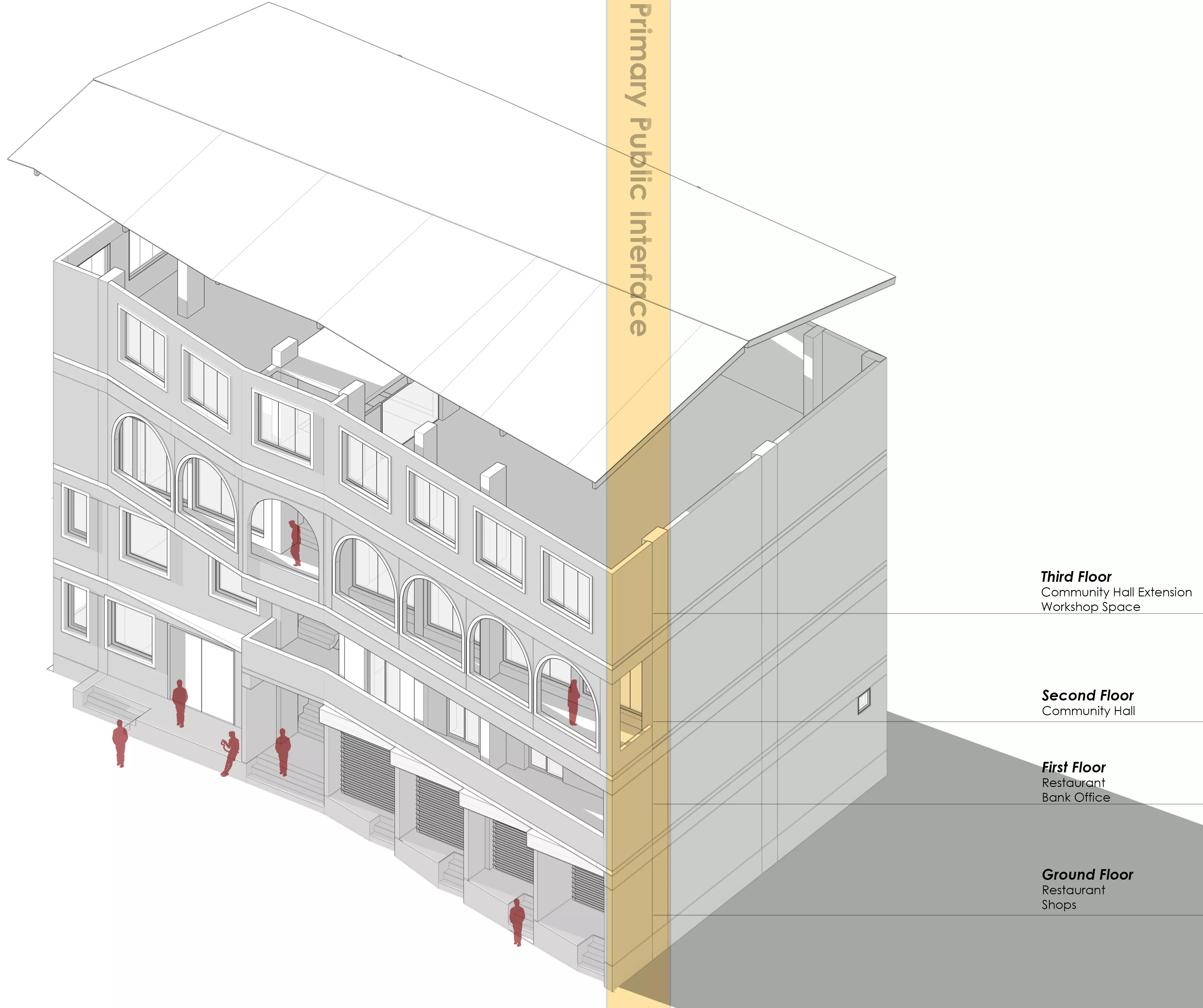 The site, on Dharavi main road was an old Ground floor structure owned by the Koli Jamat Trust, and rented out to shops. The existing shops and the restaurant on site were to be rebuilt for the same purpose and the first floor was made to be let out to a bank and as an additional level for the restaurant. The Second floor is where the Jamat chose to locate their own community hall, with an extension on the terrace. The second and third floors were where the community expended most of their efforts, the Koli Community hall in the process of its construction was visited by almost every person from the Koliwada, to discuss, share ideas and develop the design.