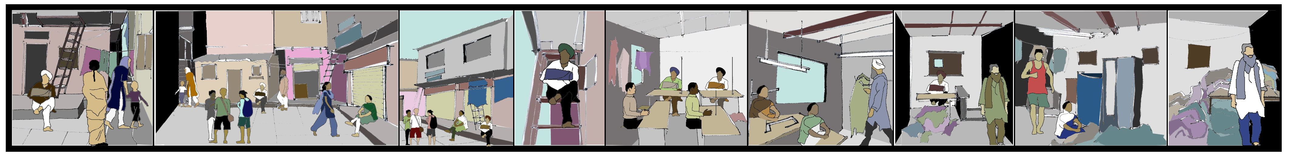 A small lane to the left from Dharavi depot road, towards Maharashtra Nature Park, opens up to a small open space with Muzaffar’s tool – house as a back drop. With children playing in the open area, and people using it for transition, it remains lively. An external ladder from the ground floor leads up to Muzaffar’s garment workshop which is a 225 sq. ft. area with 8 sewing machines and 7 workers, 3 to 4 of whom stay in the workshop at night for security purpose.