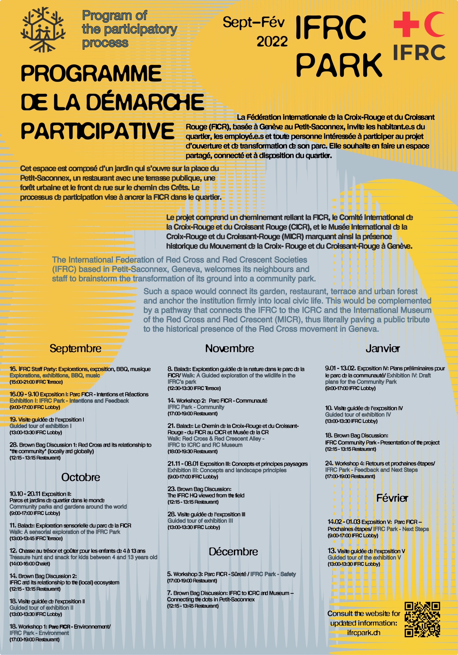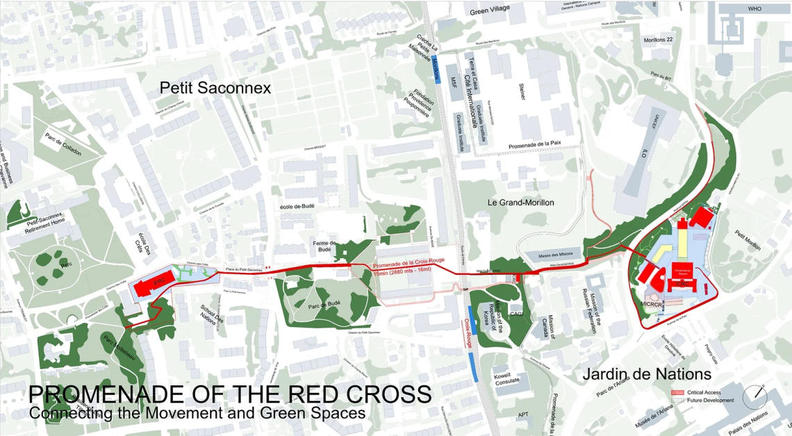 The future park is seen as a tribute to the historical presence of the IFRC in the neighbourhood and city of Geneva. The project also aims at exploring the pedestrian path between the IFRC and the ICRC and the International Museum of the Red Cross and Red Crescent. Interviews in the next phase will include institutions such as the churches, the mosque, the schools and the retirement home. Neighbors living in buildings directly adjacent to the park will also be invited to a presentation of the project and feedback session. Interviews will be conducted with a certain number of IFRC staff in Geneva and the field.