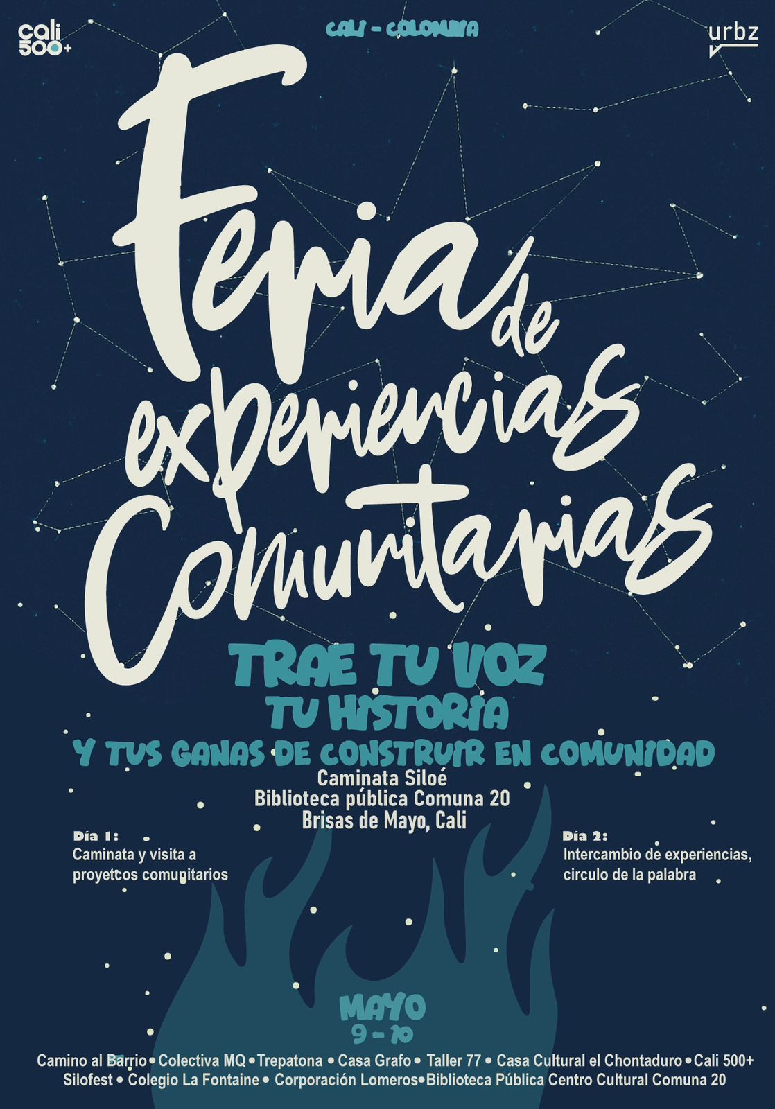 As part of the process we are organizing a 2 days event which brings together some of the most innovative and pro-active collectives in Cali, including Cali 500+, Camino al Barrio, Colectiva MQ, Casa Grafo, Casa Cultural el Chontaduro, Colegio la Fontaine, Corporacion Lomerito, Taller 77 y la Biblioteca Publica Centro Comuna 20. The event, called “Feria de Experiencias Comunitarias” (Fair of community experiences) takes place on May 9 and 10, 2025 in Siloé, one of Colombia’s largest homegrown neighborhoods and it is open to all. Contact us for more information on how to participate.