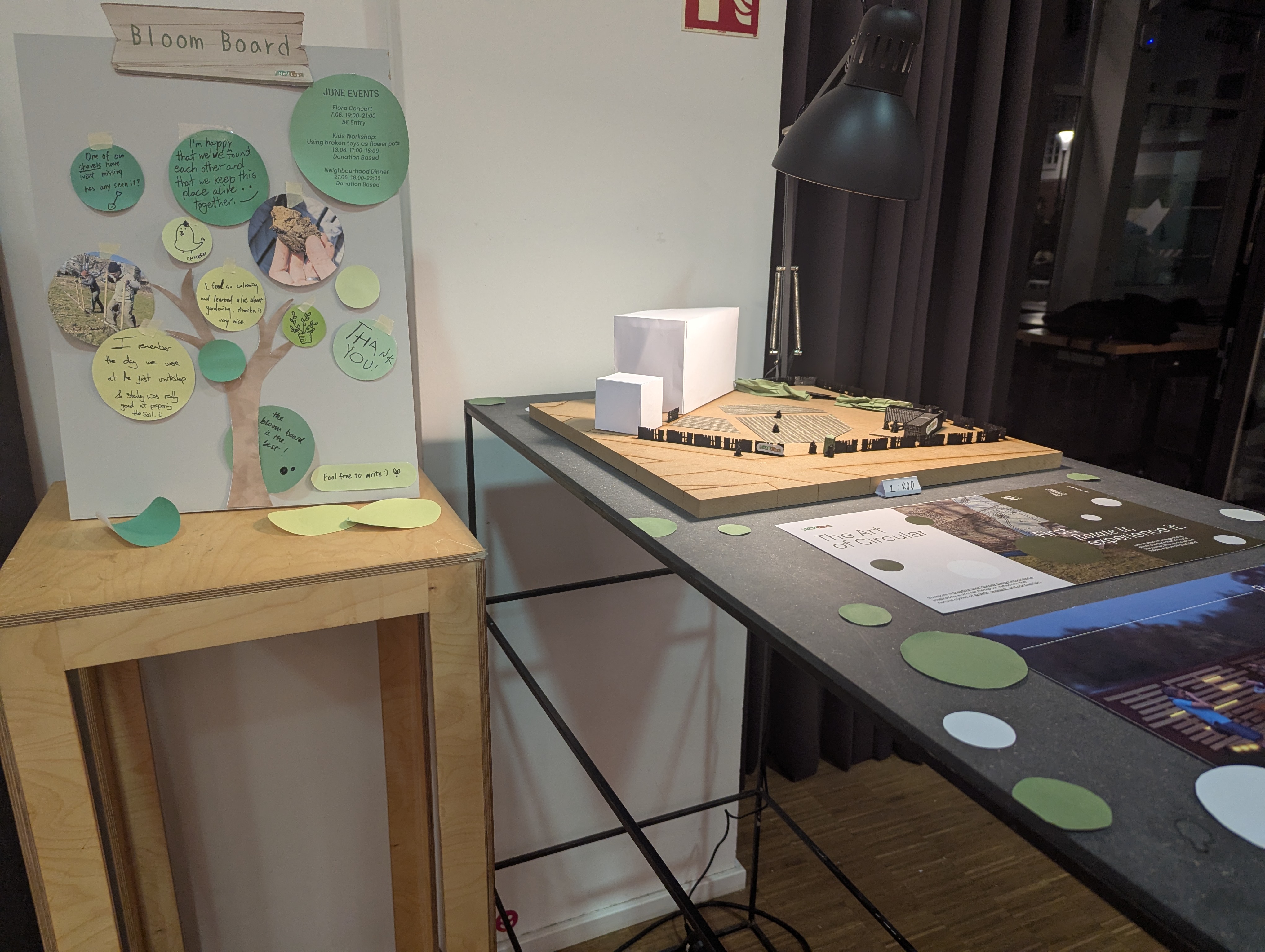 _A bulletin board (the bloom board) placed by the entrance, facing the street. It can display activities, events, workshops, and community feedback for passers-by to read. It serves as an open invitation to engage.