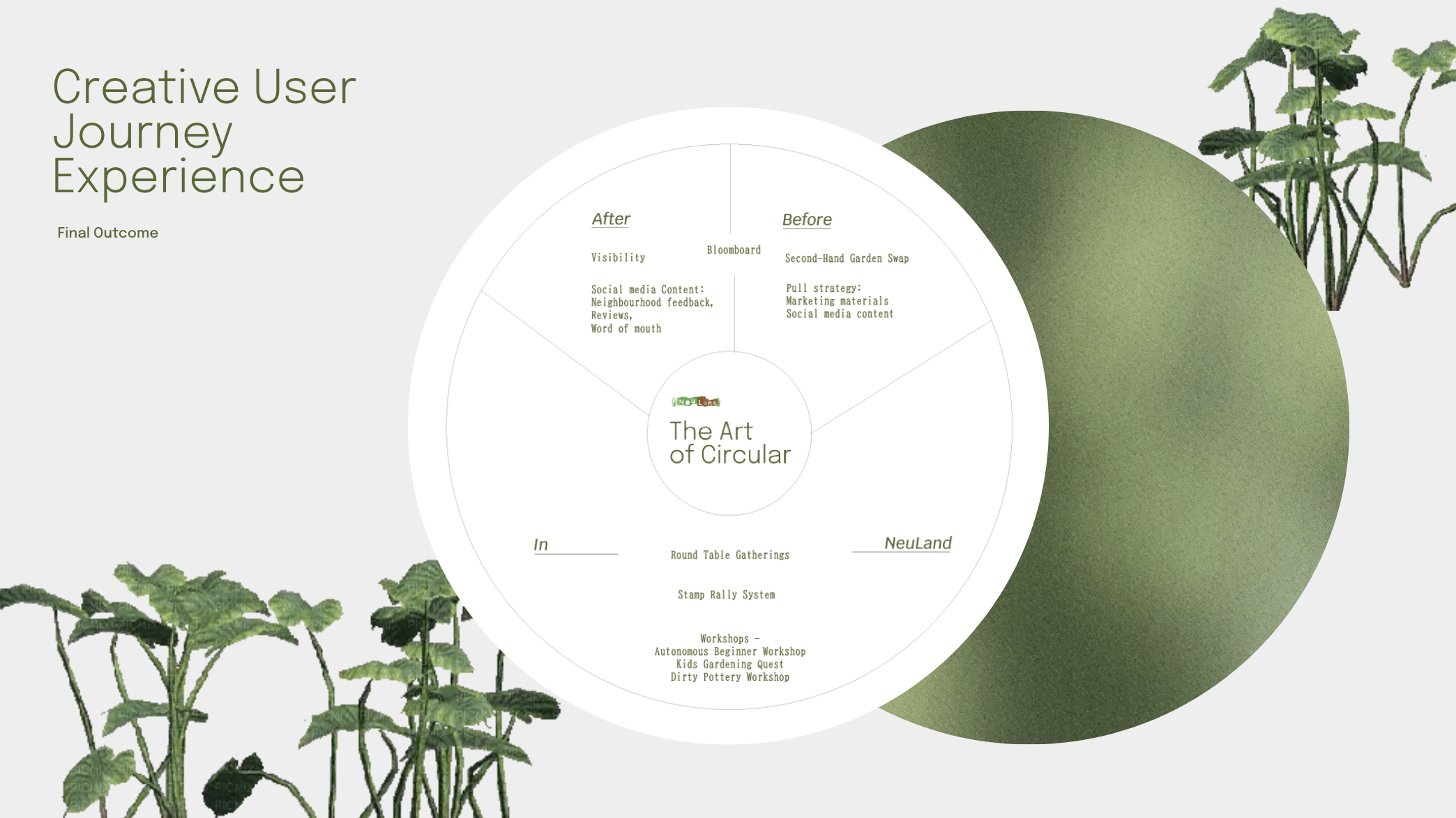 NeuLand is a community garden in Cologne: a successful urban farming project in need of attracting a larger community, especially since its recent re-location to a new site. The six GDI students (Jonas, Kryzsztof, Vanessa, Stanley, Momodo, Beilei) who worked on NeuLand paid a lot of attention to the idea of circularity at every level of their engagement. Inspired by the circularity of seasons and agriculture, and by the uniqueness of the “round table” – around which exchange and interaction happen in a more dynamic form than elsewhere –, they saw the potential for the garden as a centering space in its neighborhood, that invites everyone in.