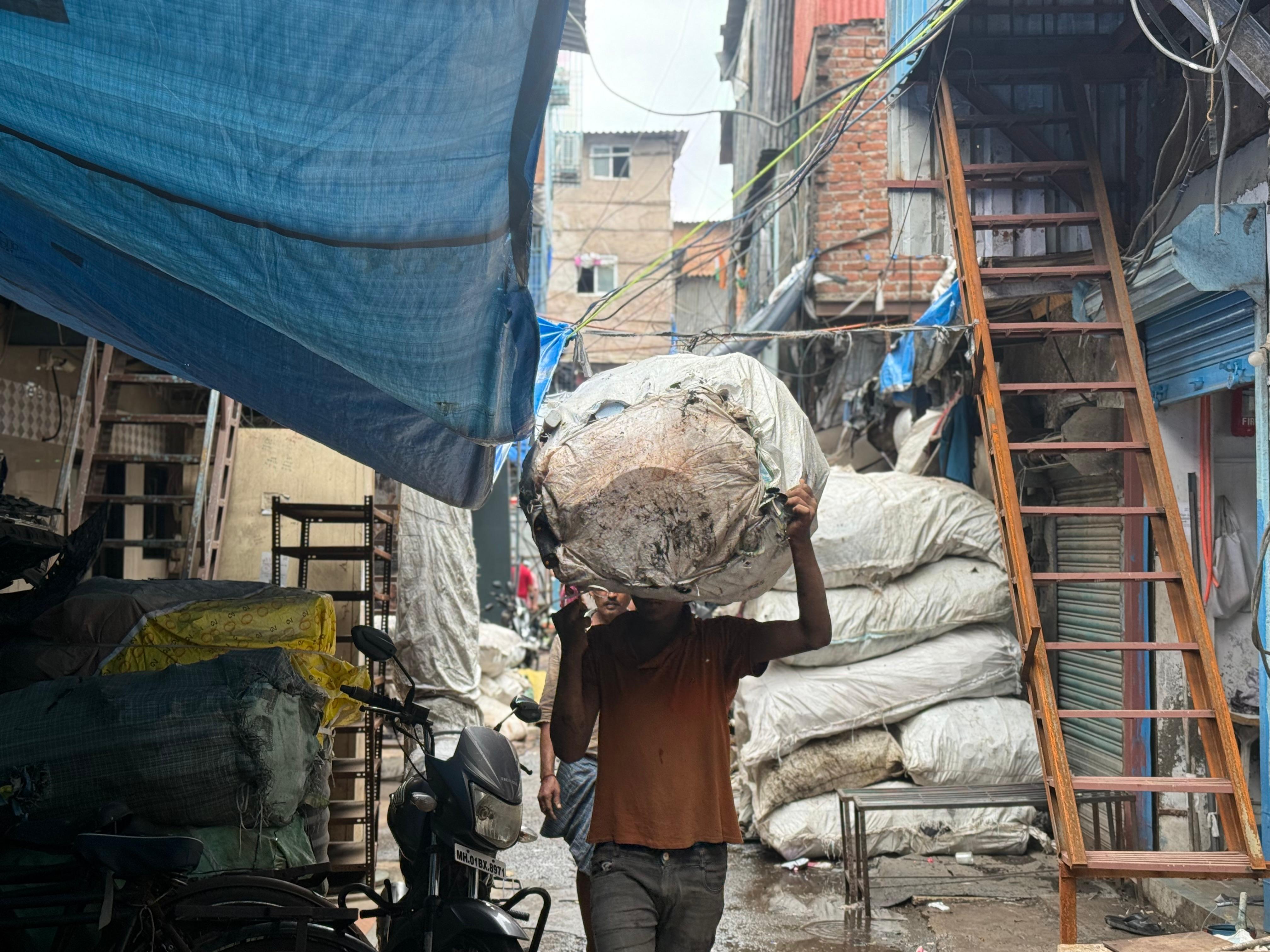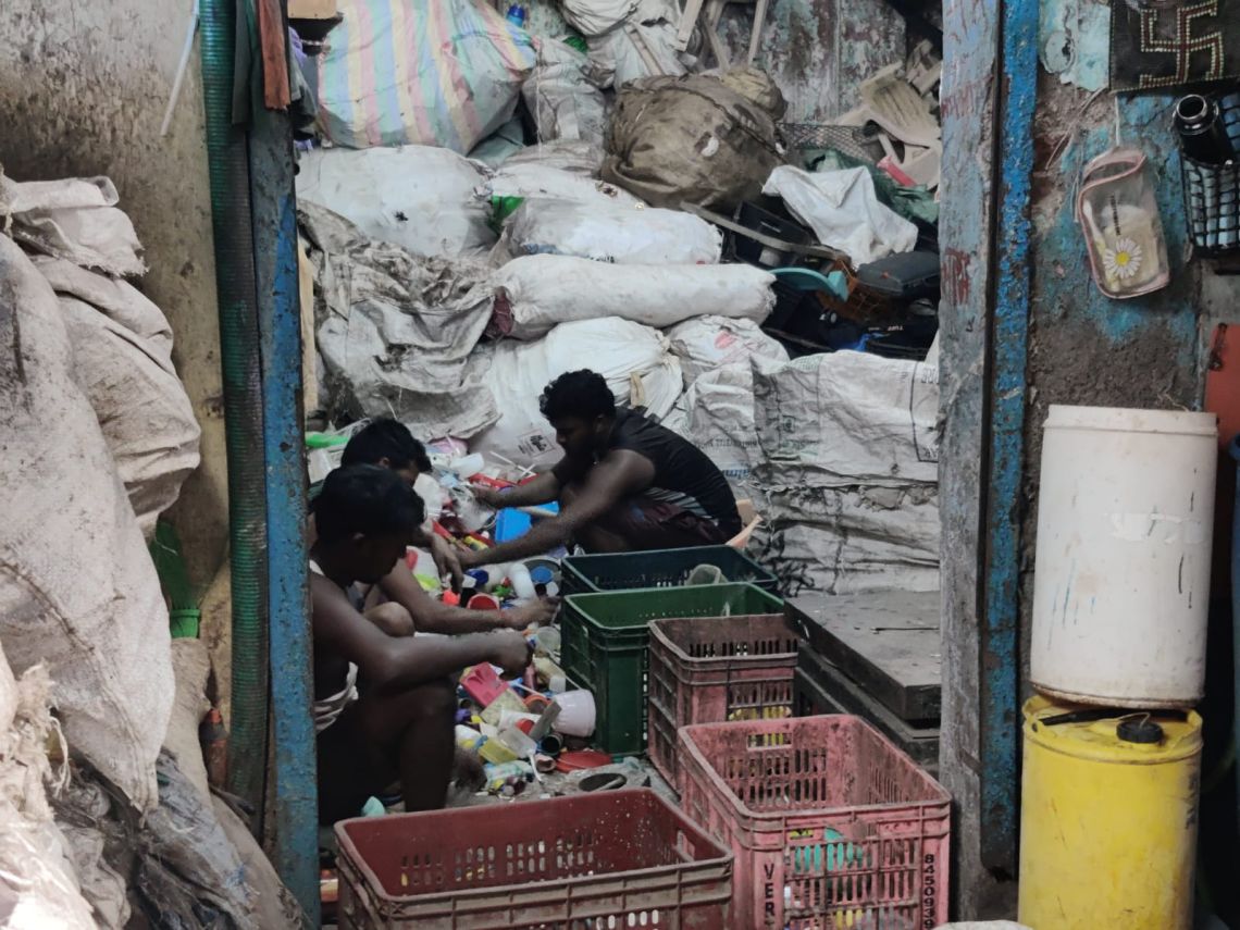 The thick, humid monsoon air clung to us as we made our way to The Plastic Yard, a recycling unit alive with machinery, nestled between the damp lanes and buzzing markets in the 13th compound off Dharavi’s 60 Feet Road. The 13th Compound, known for being a hub of informal recycling of plastic and metal, branches into endless veins of tempos overflowing with waste collected from the city, and godowns churning with heavy crushers. The narrow lanes led to snack shops and workers humming old Bollywood songs, the roofs dripping in the monsoon with a mixed waft of biryani and metals. Unlike the streets of other neighbourhoods, there were spaces where time moved either too quickly or too sluggishly; the crushers rattling 5 tons of plastic and workers humming songs while sorting materials formed a strong contrast.