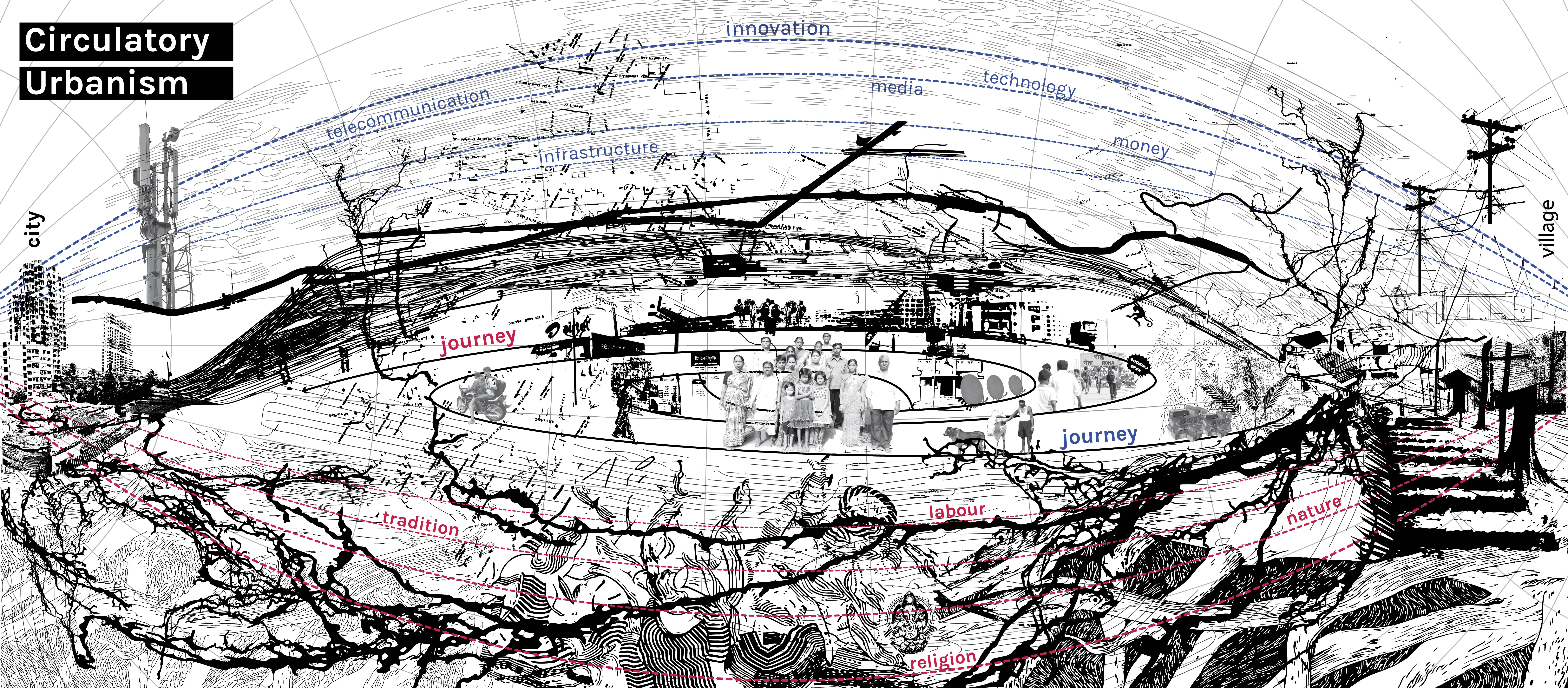 Circulatory urbanism is a concept we have conceived and worked on for over 3 years now. Our initial studies for circulatory urbanism explored migratory patterns within the Mumbai-Konkan connection. We followed various families on their trip between Mumbai and their respective villages, a recurring movement that could be as frequent as once a month, biannually or yearly. What really interested us in this circulatory movement between the village and the city is that people’s roots extended from one to the other. A person’s idea of ‘home’ is neither here nor there. In a way, they live in the intangible space that exists between the two.