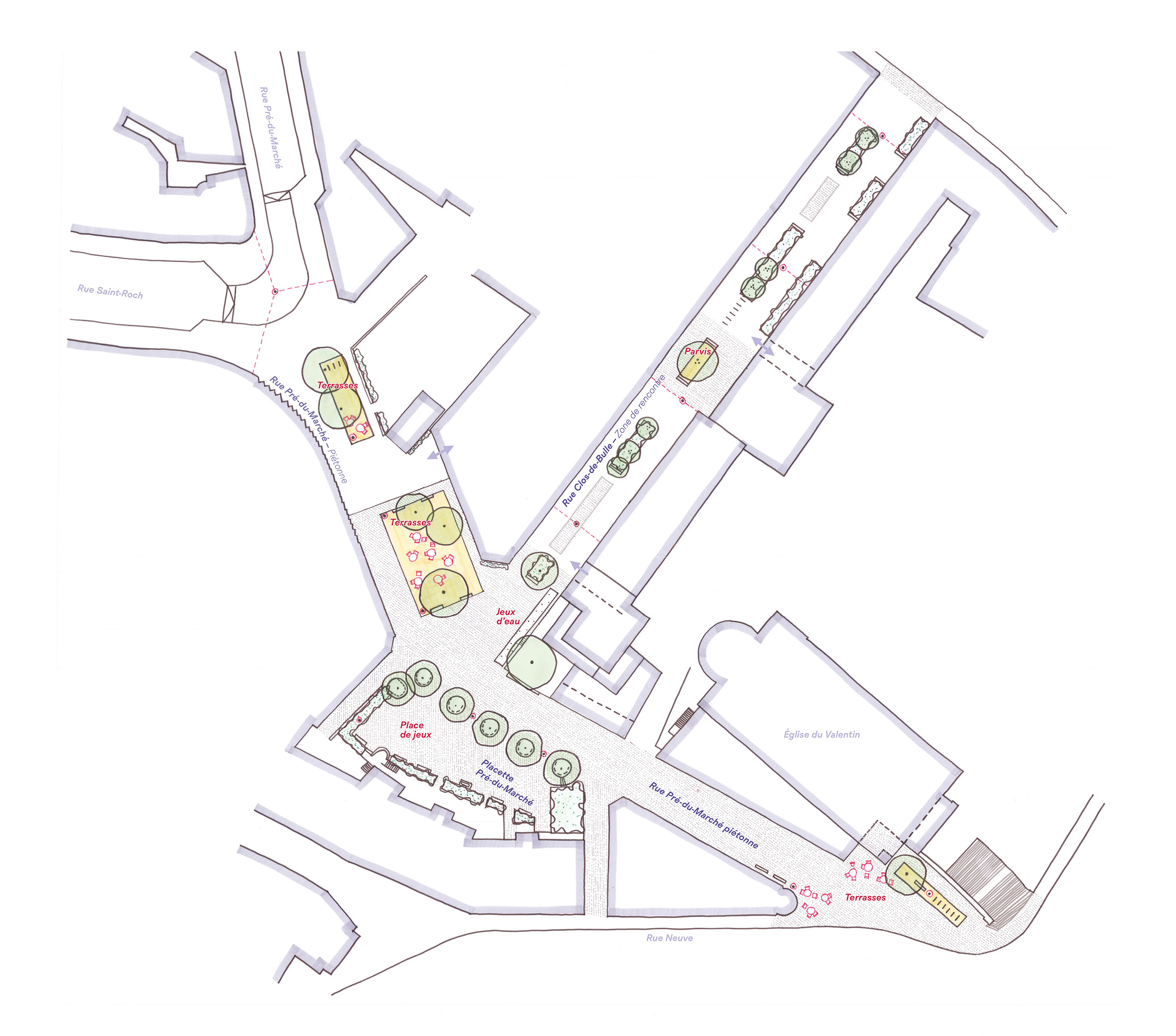 With the main aim of bringing peace and quiet to the heart of the district and improving the quality of life for residents and users, the development project for Rue Pré-du-Marché and Rue du Clos-de-Bulle involves extending the existing pedestrian zone to the junction with Rue Saint-Roch and creating a meeting zone on Rue du Clos-de-Bulle.