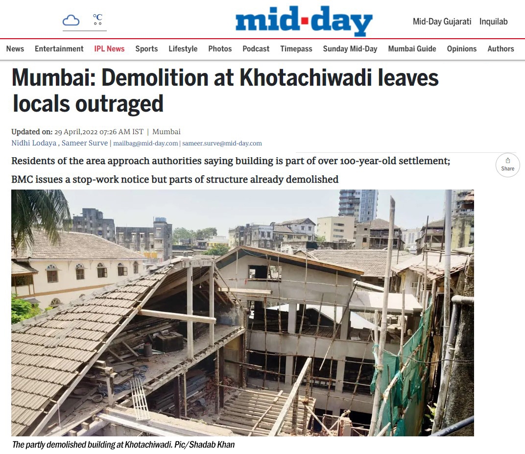 In the last week of April 2022, yet another abandoned property was on the verge of getting completely demolished. However, some local residents rallied together once more to raise their voices, and successfully managed to get a stay order from the BMC on the ongoing demolition.