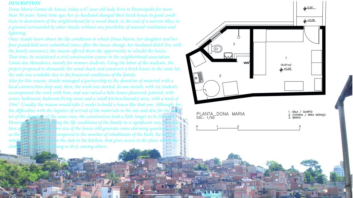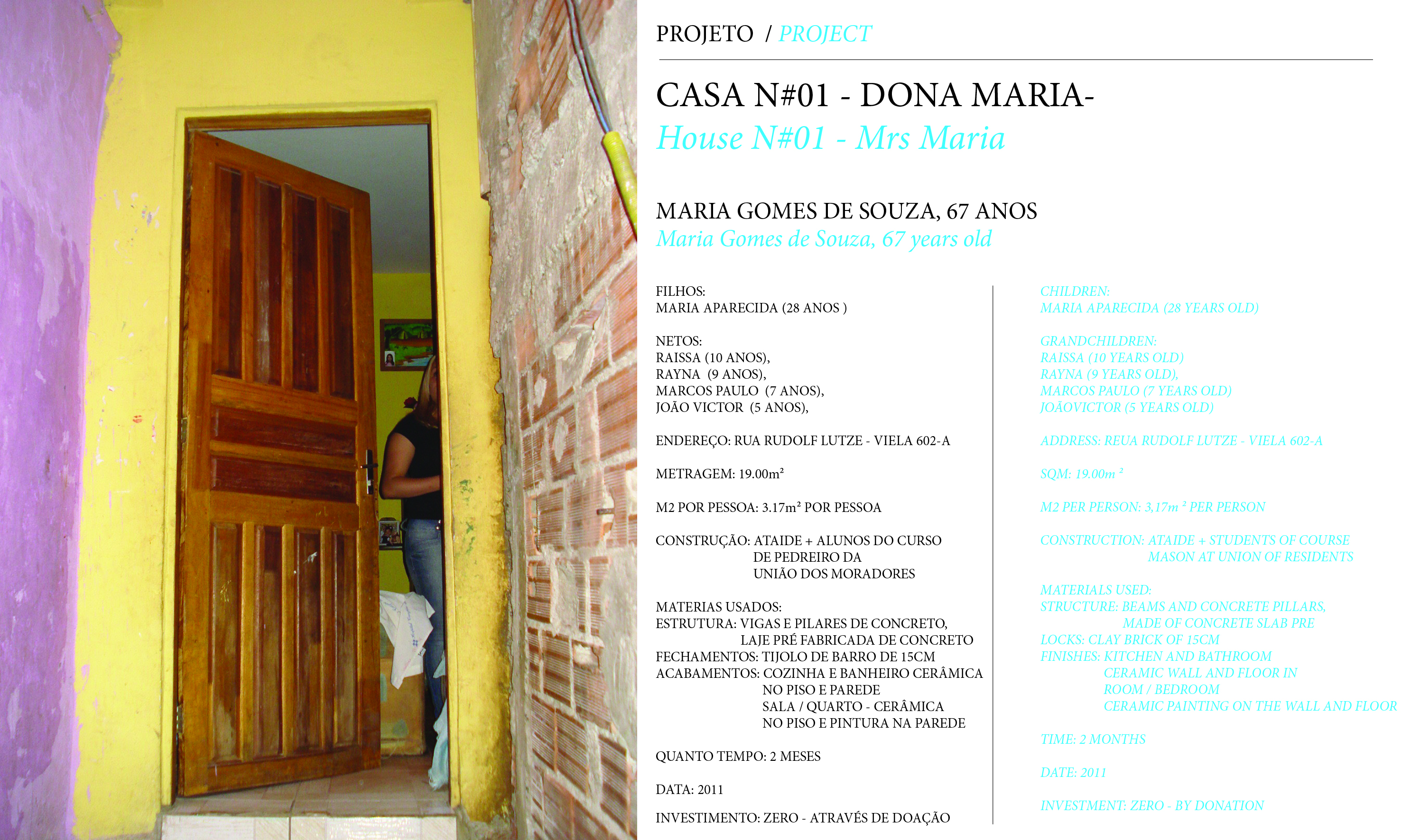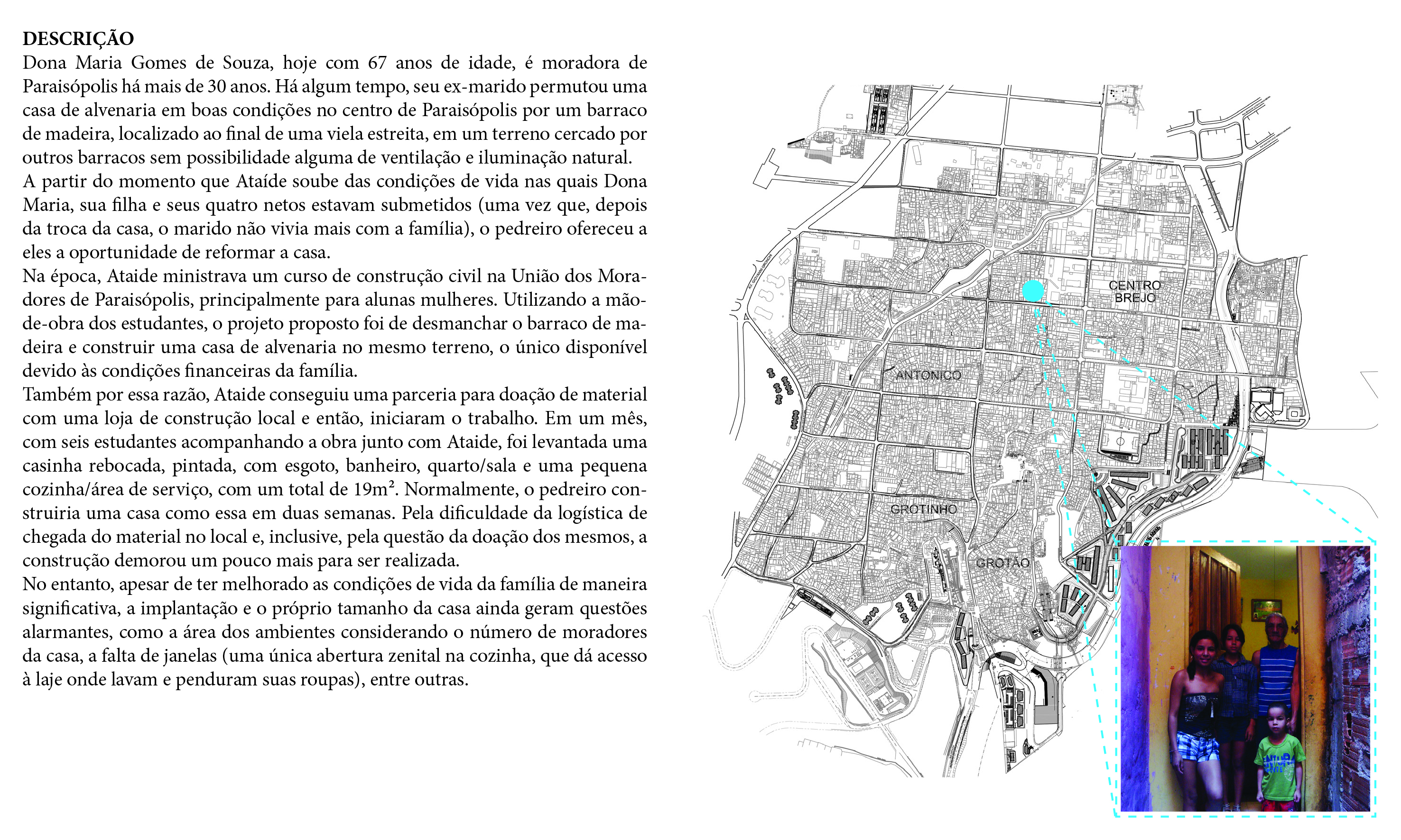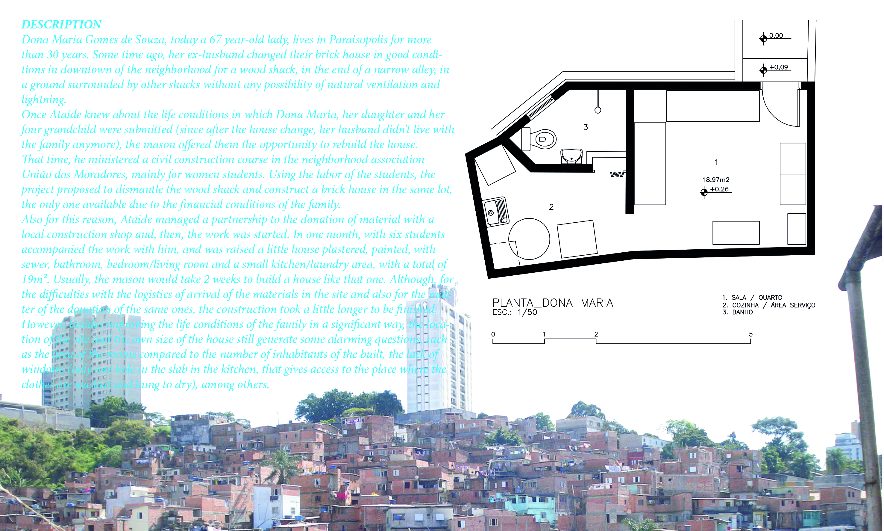 O livro consiste em um registro de 50 casas construídas pelo pedreiro Ataide Caetite na favela de Paraisópolis, enfocando na questão de como o modo de sociabilidade,o modo de vida e as dinâmicas econômicas e culturais se refletem no espaço familiar construído: a casa. Por meio de levantamentos das casas construídas por Ataide e de entrevistas com seus moradores, buscando entender a historia de sua vida na comunidade, o projeto tem como finalidade apresentar a sociabilidade particular inerente à favela, propiciando uma aproximação desse modo de vida e dessa realidade social. A relação familiar, o sentimento de pertencimento e o senso de comunidade, a forte organização social, o papel da laje e da rua como espaços de encontro e de vivencia coletiva, e o ‘se virar’ (fazer o melhor com os recursos disponíveis) caracterizam o modo de vida nesse perfil de lugar.