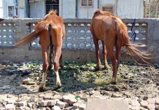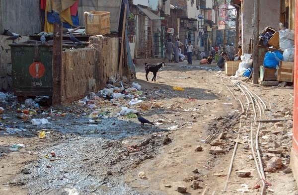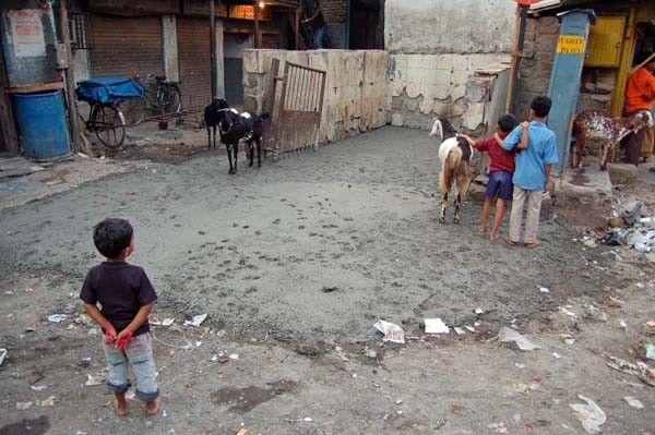 This waste collection is temporarily out of use. A concrete floor was just cast. Goats are waiting till their familiar spot offers something to eat. Foot prints in the fresh concrete are witness of their impatience.