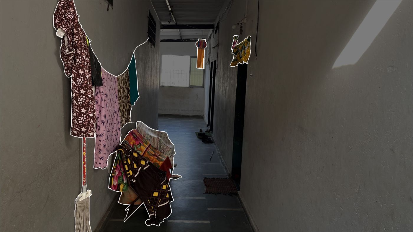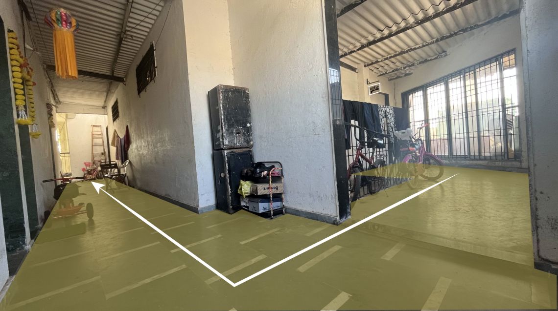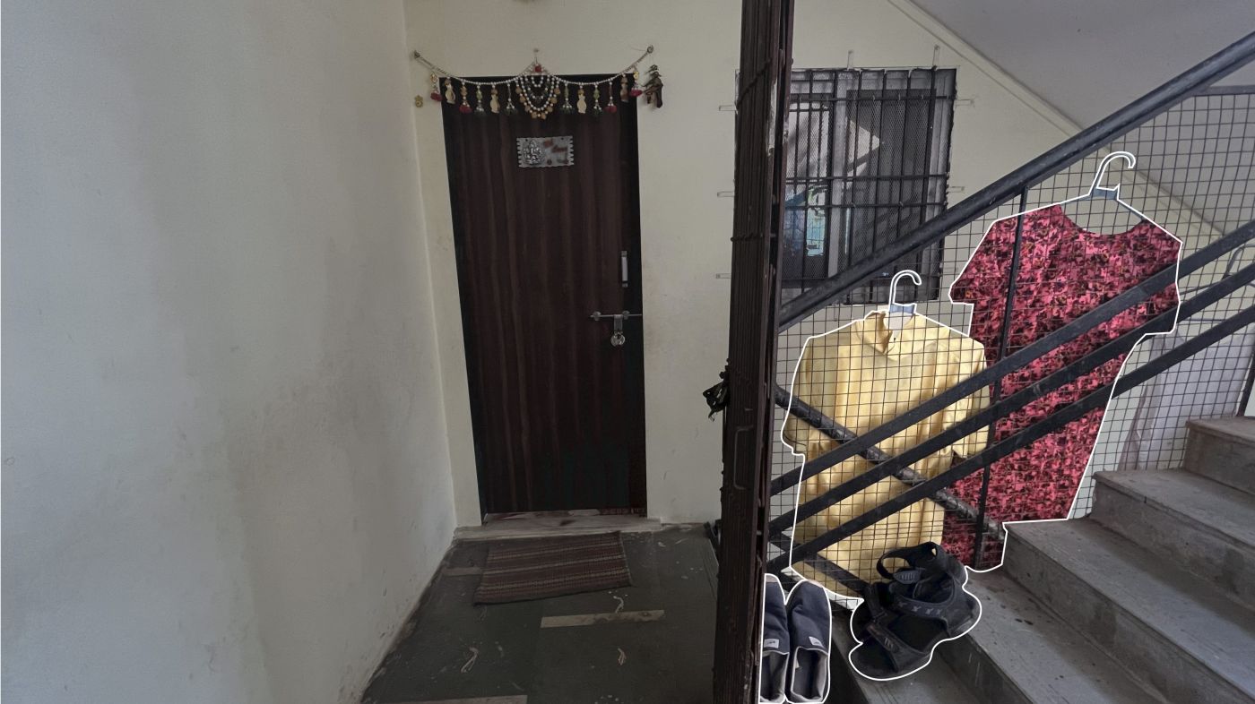 These corridors form the most interesting spaces in the chawl. Habraken in his book Structure of Ordinary defines these spill-over spaces between the private to the public realm as ‘home turfs’, where residents experience an unspoken sense of ownership and claim the small space as their territory with intangible boundaries, which is often marked by tangible objects such a toy cycle, shoe-rack and chairs. The wall around their doors was decorated with embellishments and claimed as their own. There is also a different degree of privacy amongst rooms, the last room on each floor is somewhat pushed outside slightly and placed at a step below, which could be interpreted as more private or isolated according to the residents. One of the residents, Meena, enjoyed living on the end of the corridor claiming, ”It is quieter and has more room for us in the corridor”. The linear corridor then leads to a backside entrance, for easy access of the residents. That space overlooks the tree canopy and open ground. Meena also mentioned,” I like sitting on the stairs in the evening. Most residents use the front staircase, so sitting here in the fresh air, overlooking trees, is a daily activity I enjoy”. Openings on either end of the ‘L’ corridor ensure ventilation, a strategic design decision that enhances the experience while using the common space.