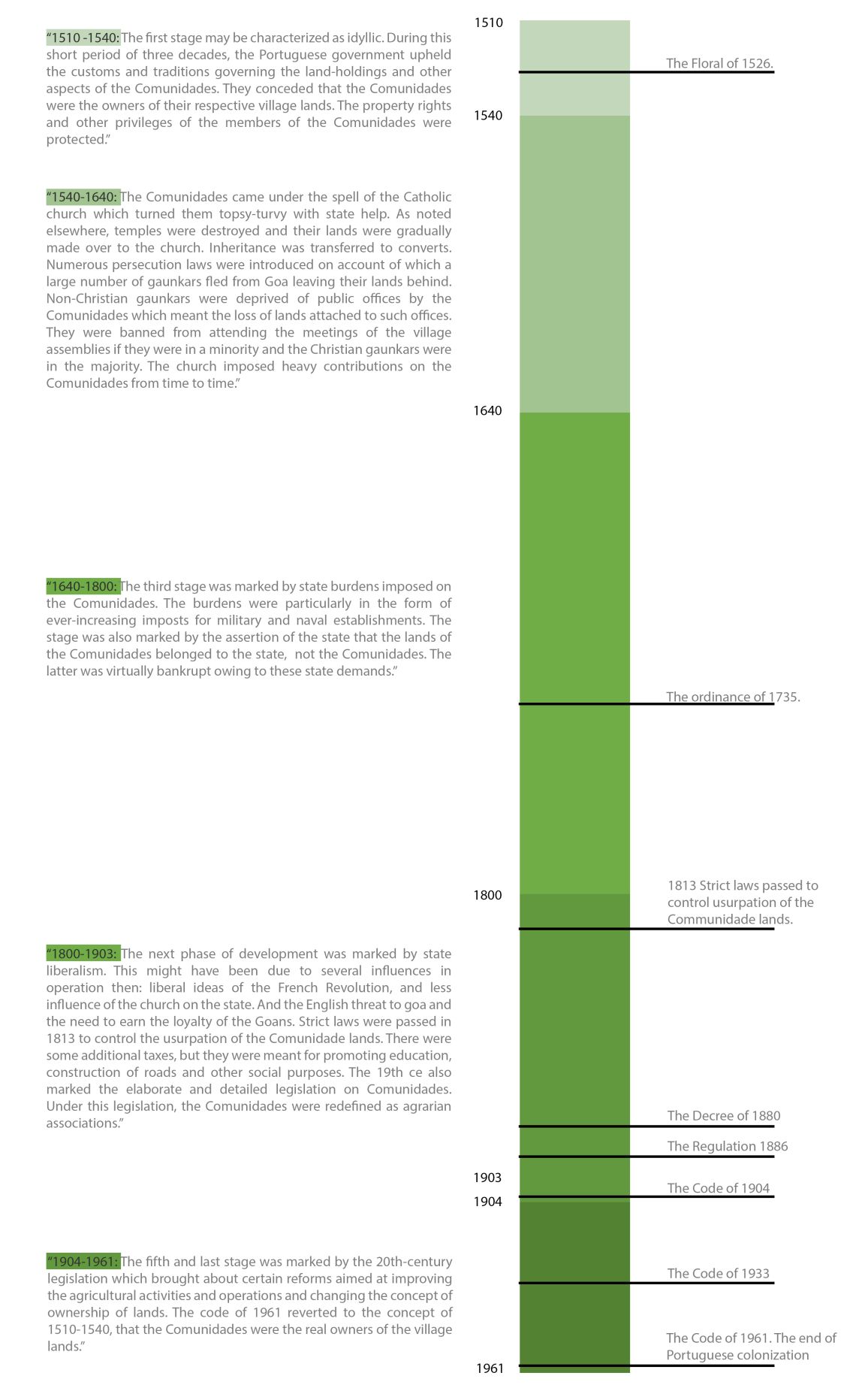 When the Portuguese came to Goa in 1510, they found the gaunkaria system self-sustaining and convenient “to collect revenue from the people through taxation”.(Jacob, 2019) They renamed this gaunkaria system to Comunidade (translates to commune in Portuguese). They left the original organisational structure largely untouched as they saw this as an opportunity to seize control. In 1526, “the Foral de Usos e costumes dos Gauncares (the charter of rights and duties of the gaunkars)”(Jacob, 2019) was compiled by the Portuguese revenue superintendent Afonso Mexia that “established the rights and privileges of the gaunkars and codified some of the administrative, juridical and financial rules and norms” (Jacob, 2019). Under the Portuguese, all of the non-private lands in a village were owned by the Comunidades and were regularly auctioned.