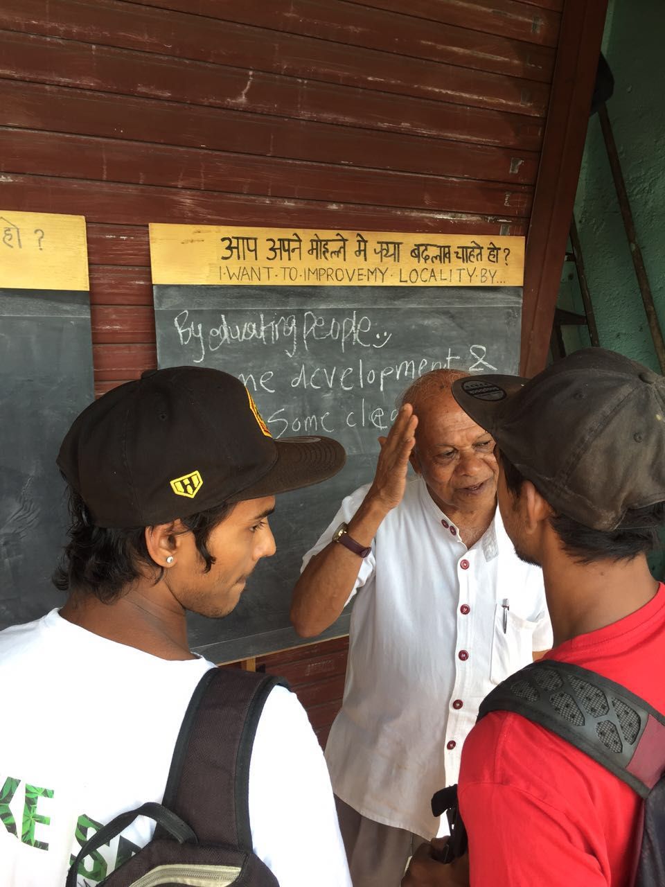 Moving away from the typical style of engineering projects, and from the initial idea of pure “handstorming”, the final group dealt with a tricky subject: Property rights, ownership and community dynamics. After studying housing situations and ownership patterns in various neighbourhoods in Dharavi, the team arrived at the conclusion that in order for government bodies like the Slum Rehabilitation Authority to create relevant housing solutions for the development of Dharavi, there needs to be a dialogue between the residents and official bodies. There is immense potential among residents to organise themselves and take charge of their own living conditions. The group looked at various ways in which people living in close quarters communicate with each other, and the final output intended to be inclusive, participatory and encourage the locals to speak up about their wants, needs and visions for their own neighbourhood. The students made two notice boards which they installed in two Dharavi localities. The boards were covered with a blackboard sheet on which the residents could chalk their thoughts about what they would like to see in their surroundings.