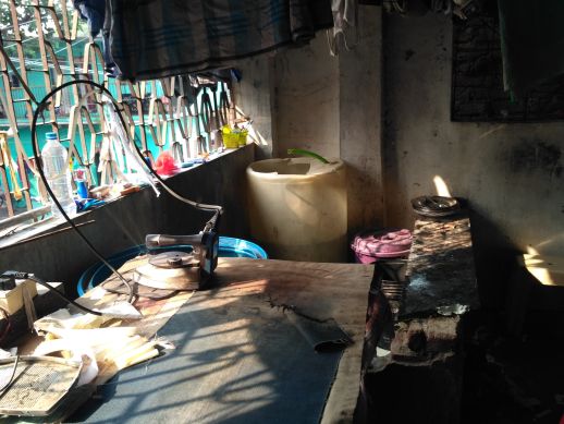 A little detour from Dharavi cross – road, with a public toilet on the left and Shiv Mandir on the right, takes us to Aameer’s occupational abode. One among many residential and small scale commercial units in the area, the garment workshop is located on the first floor, above an Idliwala’s tool – house. Aameer’s garment manufacturing unit can be reached by taking a narrow and steep ladder which directly opens up onto the work-space from the floor. With 8 sewing machines, 2 big tables for cutting and ironing and 6 workers, 4 of whom stay in the same room at night, this 325 sq. ft. area accommodates it all. His is a tool-house
